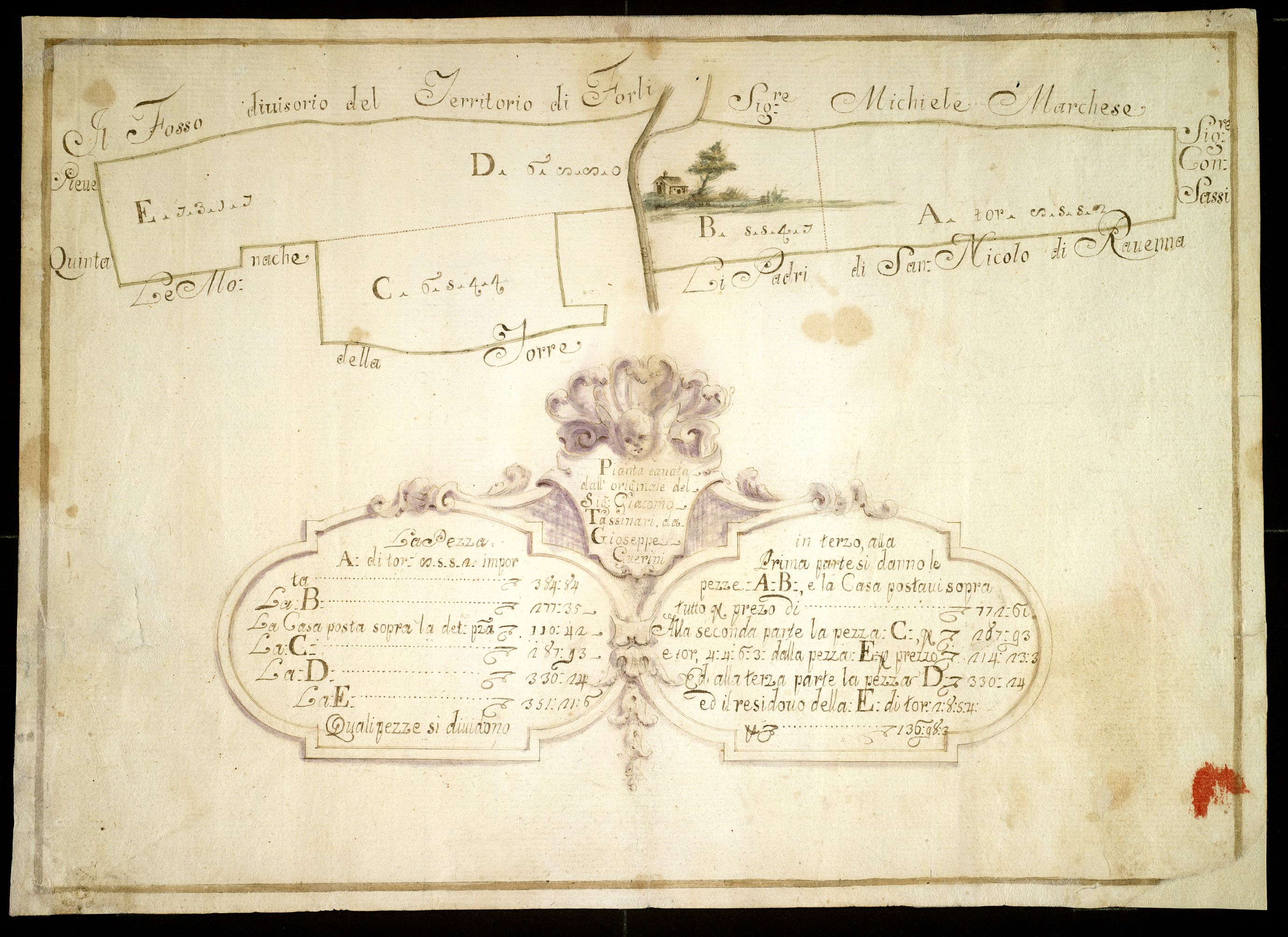 Mappa dei beni in Pieve Quinta delli PP. di S:Nicolò, delle monache della Torre, del marchese Michele Sassi, e il Fosso divisorio del territorio di Forli.