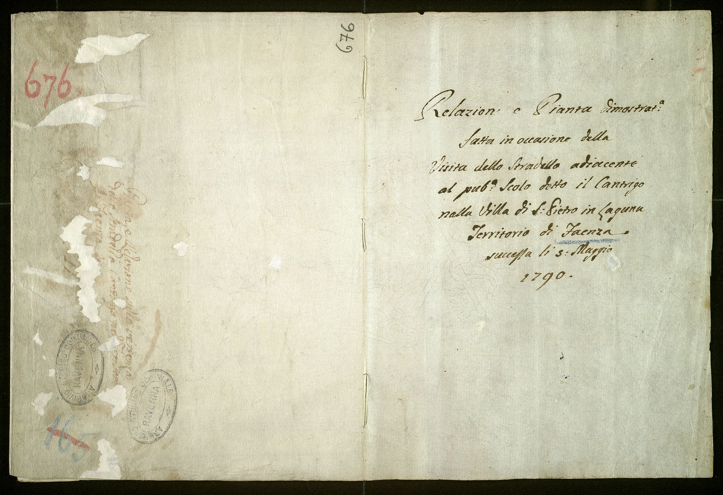 Relazione e pianta dimostrativa fatta in occasione della visita dello Stradello adiacente al pubblico scolo detto Cantrigo nella villa di S. Pietro in Laguna territorio di Faenza successa il 5 maggio 1790