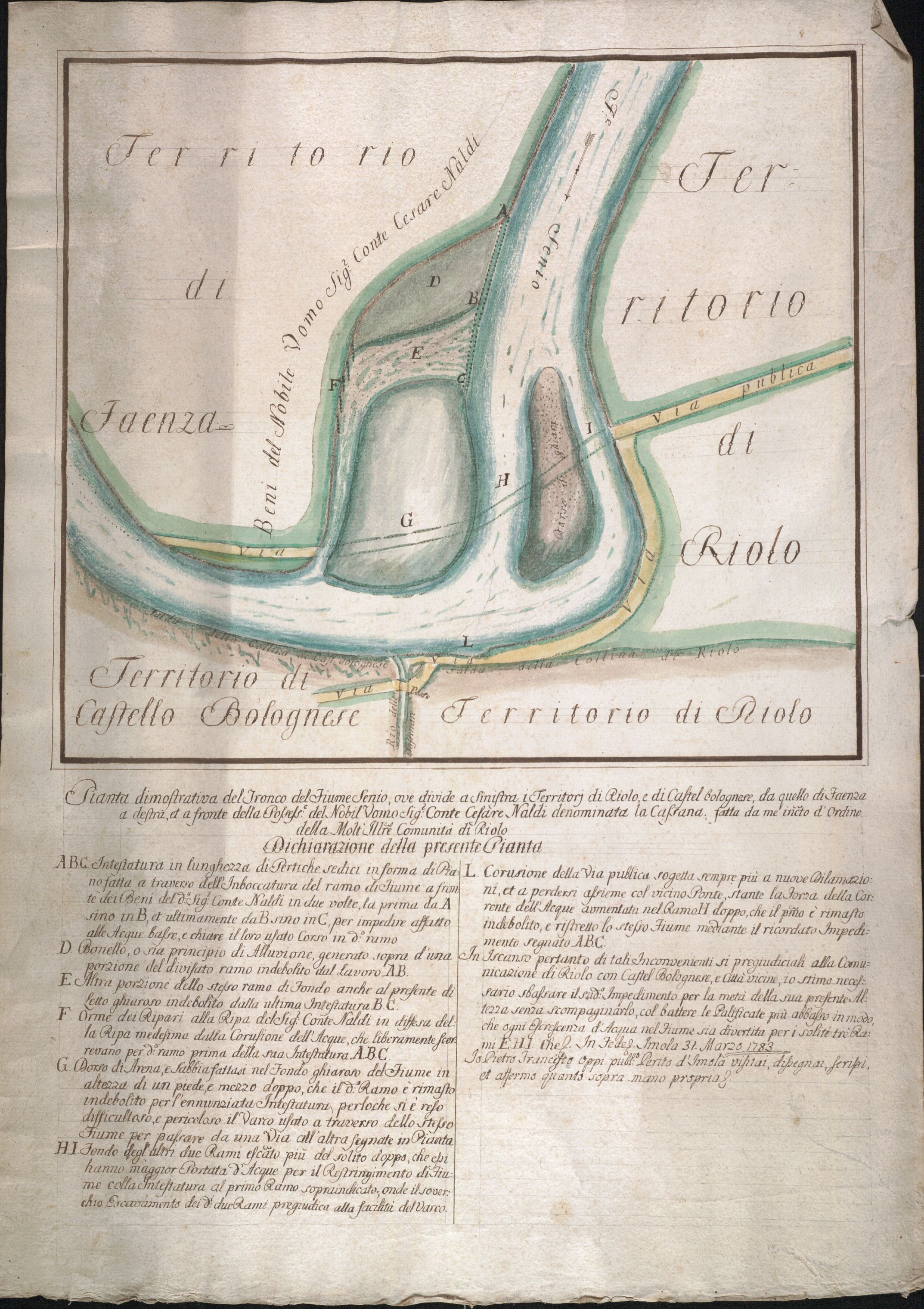 Pianta dei confini tra Faenza, Riolo e Castelbolognese presso i beni del conte Cesare Naldi sotto una svolta del fiume Senio delineata dal perito Pietro Oppi di Imola il 31 marzo 1783.