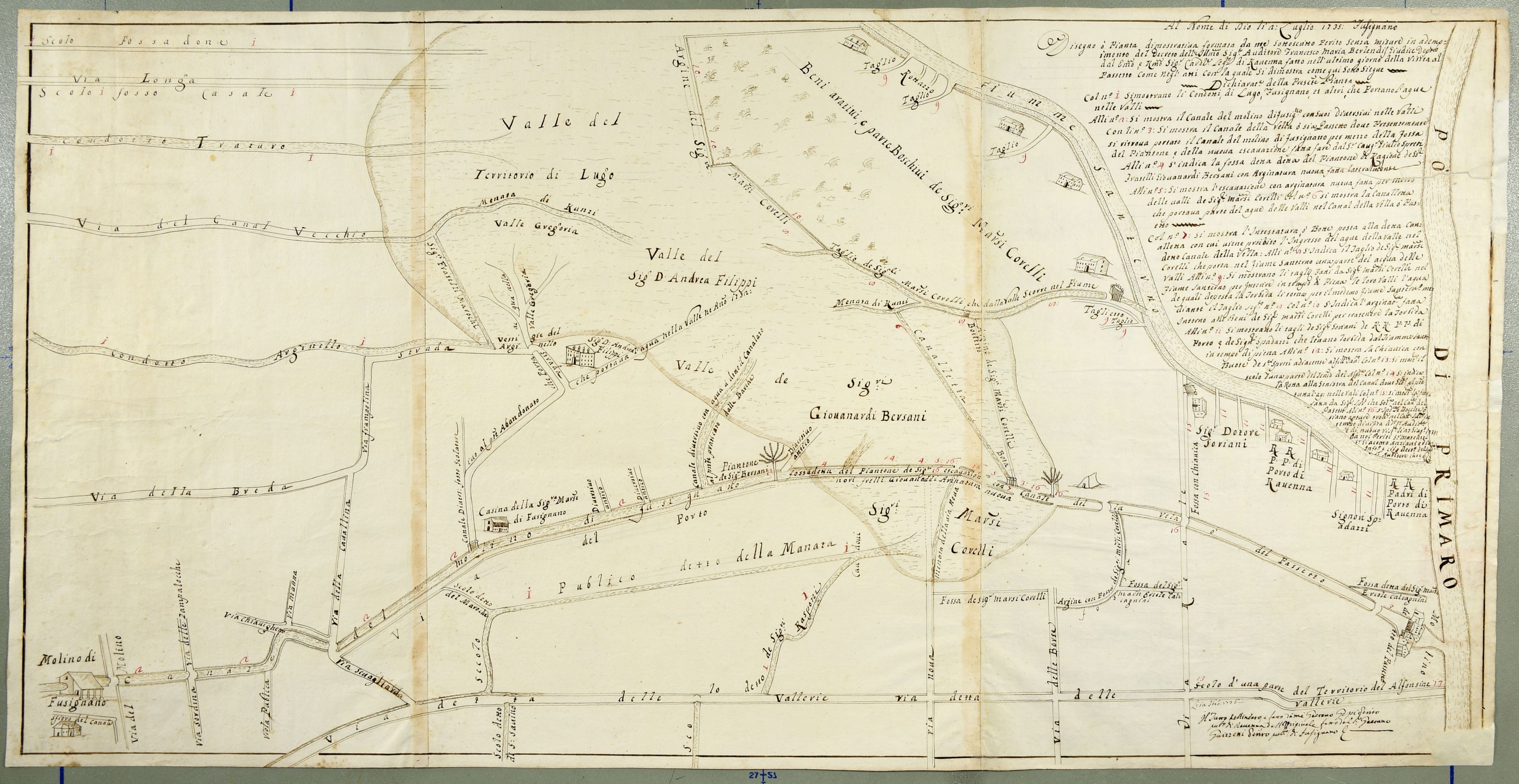 (Santerno. Taglio Corelli. Valle di Lugo. Fossadore. Fosso Casale. Condotto Tratturo. Canal Vecchio. Arginello. Via Breda. Canale del molino di Fusignano. Via delle Vallerie. Molino del Passetto. Po di Primaro.) Fusignano 2 luglio 1735