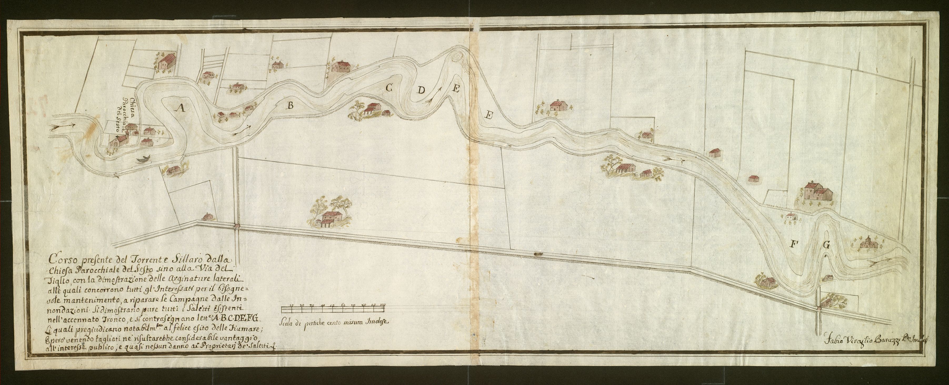 Corso del torrente Sillaro dalla chiesa parrocchiale del Sesto sino alla Via del Tiglio, con le arginature.