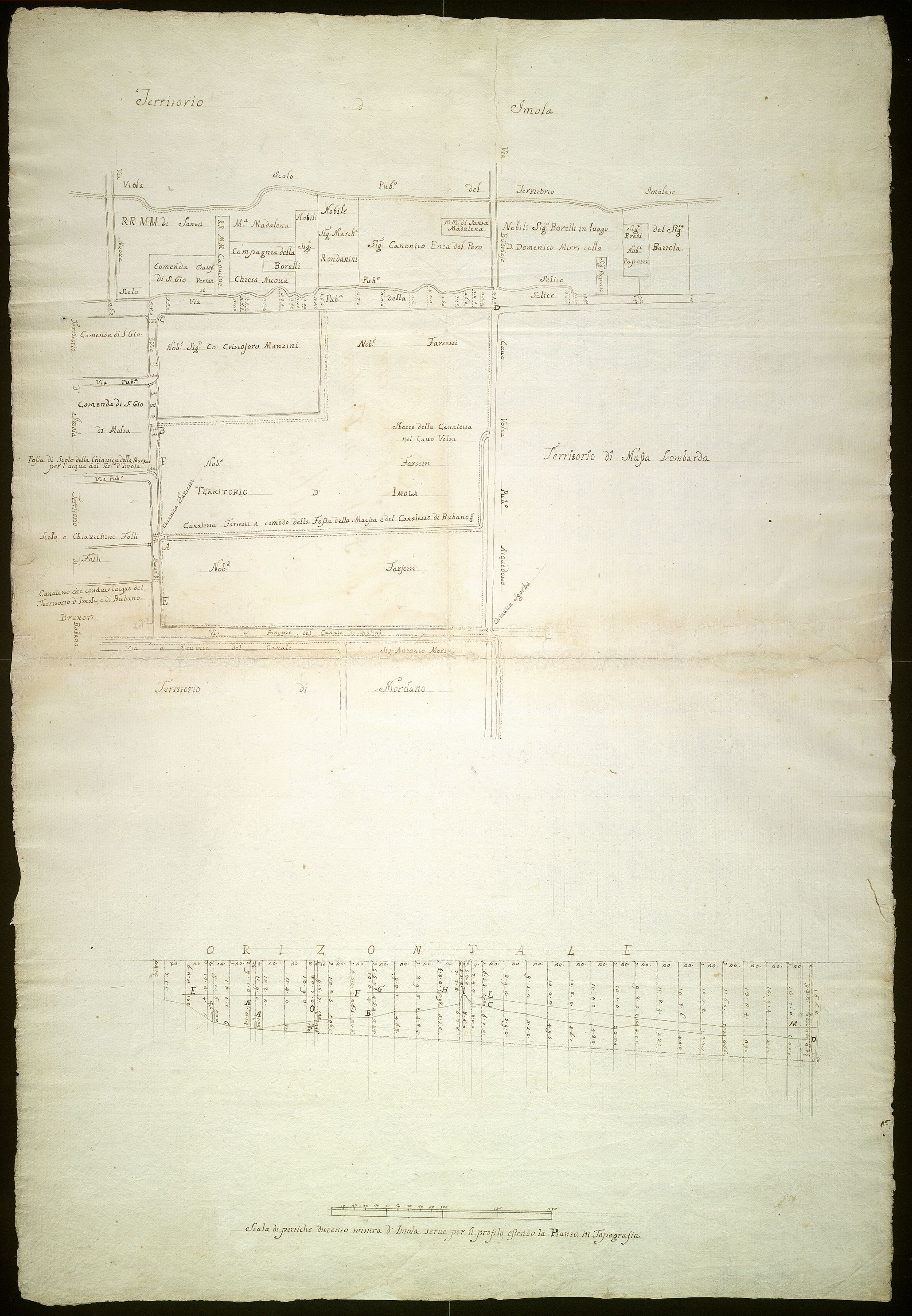 Pianta dei terreni di vari possidenti nel Comune d'Imola e di Bubano con gli scoli e Fossa conducenti le acque imolesi mediante la chiavica della Maestà con le strade dette Via nuova, e Via Selice, il Cavo Volta e la Canaletta Farsette.
