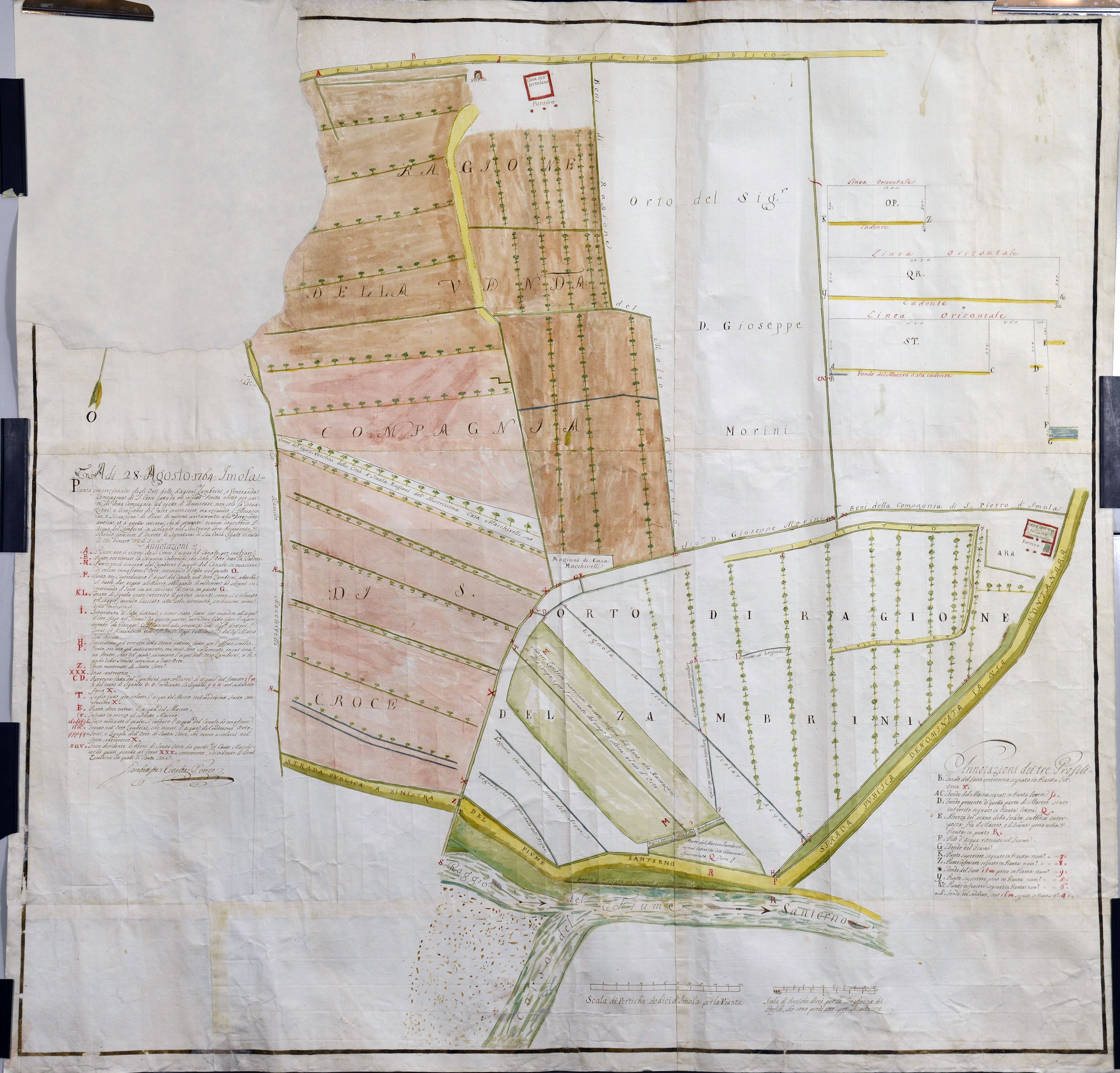 Pianta degli orti Zambrini e V.le Compagna della V. Croce posti tra il Santerno, la Via Montanara e lo Stradello pubblico presso Imola fatta dal perito Gio. Battista Rivalta nel 1764 28 agosto Imola.