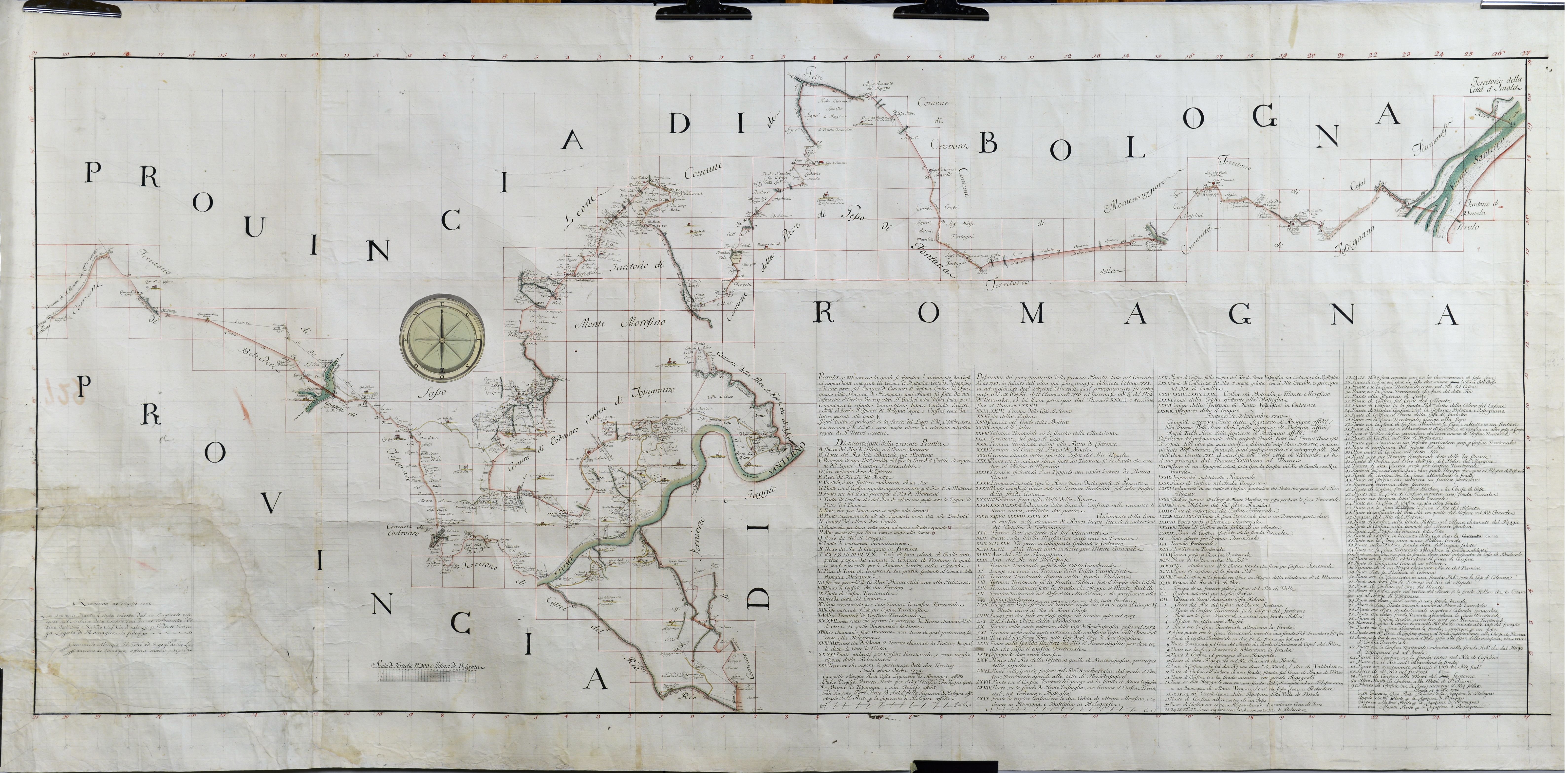 Pianta del territorio e dei confini dei comuni di Belvedere, Codroaco, Castel del Rio, Pieve di Gesso, Sasso Leone, Monte Morosino, Crovara, Montemaggiore, Casalfiumanese, della contea di Tossignano, delineata nel 1768 dai periti Camillo Morigia, Fabio Baruzzi e Giangiacomo Dotti e proseguita nel 1780 dai periti G. Dotti, Angelo Trebbi, Gaetano e Matteo Masotti.