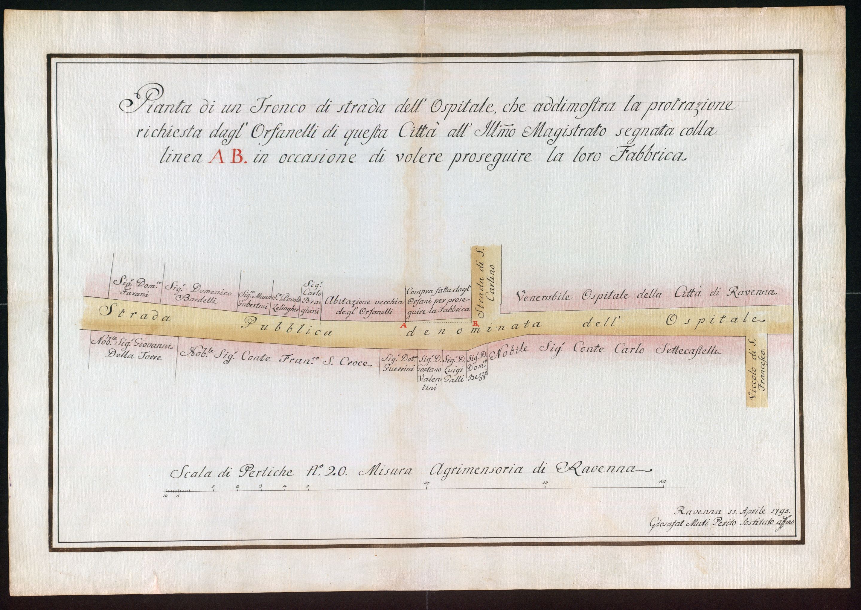Pianta di un Tronco di strada dell'Ospitale, che addimostra la protezione richiesta dagl'Orfanelli di questa città all'Illustrissimo Magistrato segnata colla linea N: B. in occasione di volere proseguire la lorro Fabbrica.