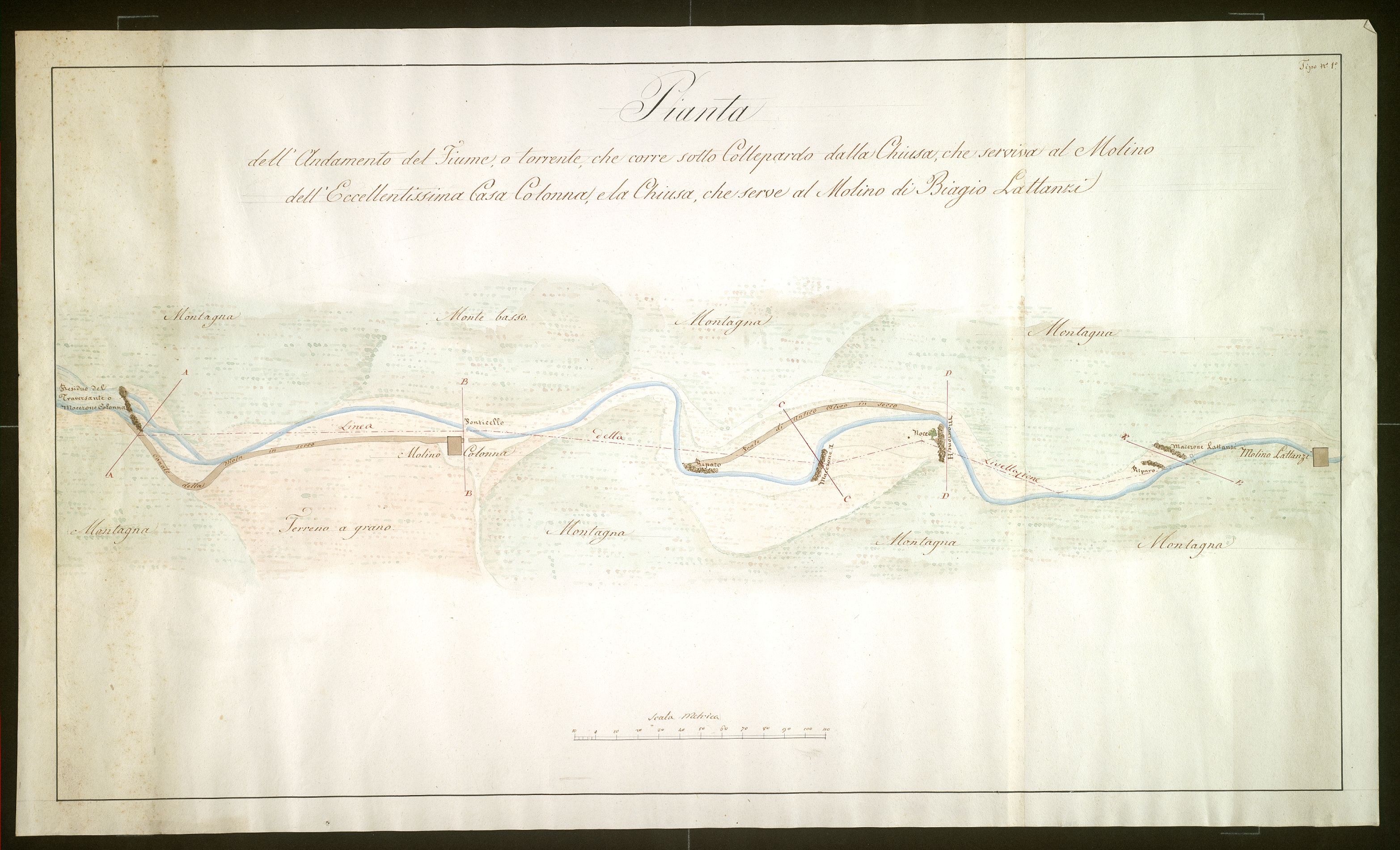 Pianta dell'andamento del fiume o corrente, che scorre sotto Collepardo dalla chiusa che serviva al molino dell'Eccellantissima casa Colon, e la chiusa che serve al molino di Biagio Lattanzi.
