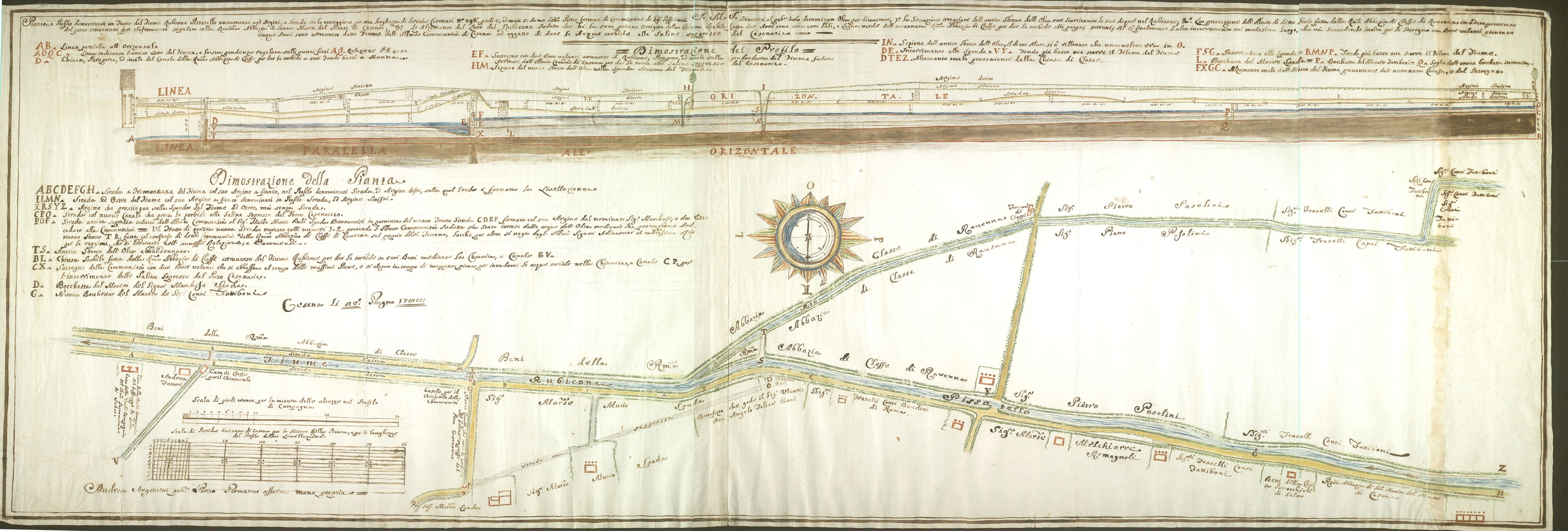 Pianta e profilo dimostrante un tratto del fiume Rubicone Pissatello unitamente agli argini e strade che lo costeggiano...