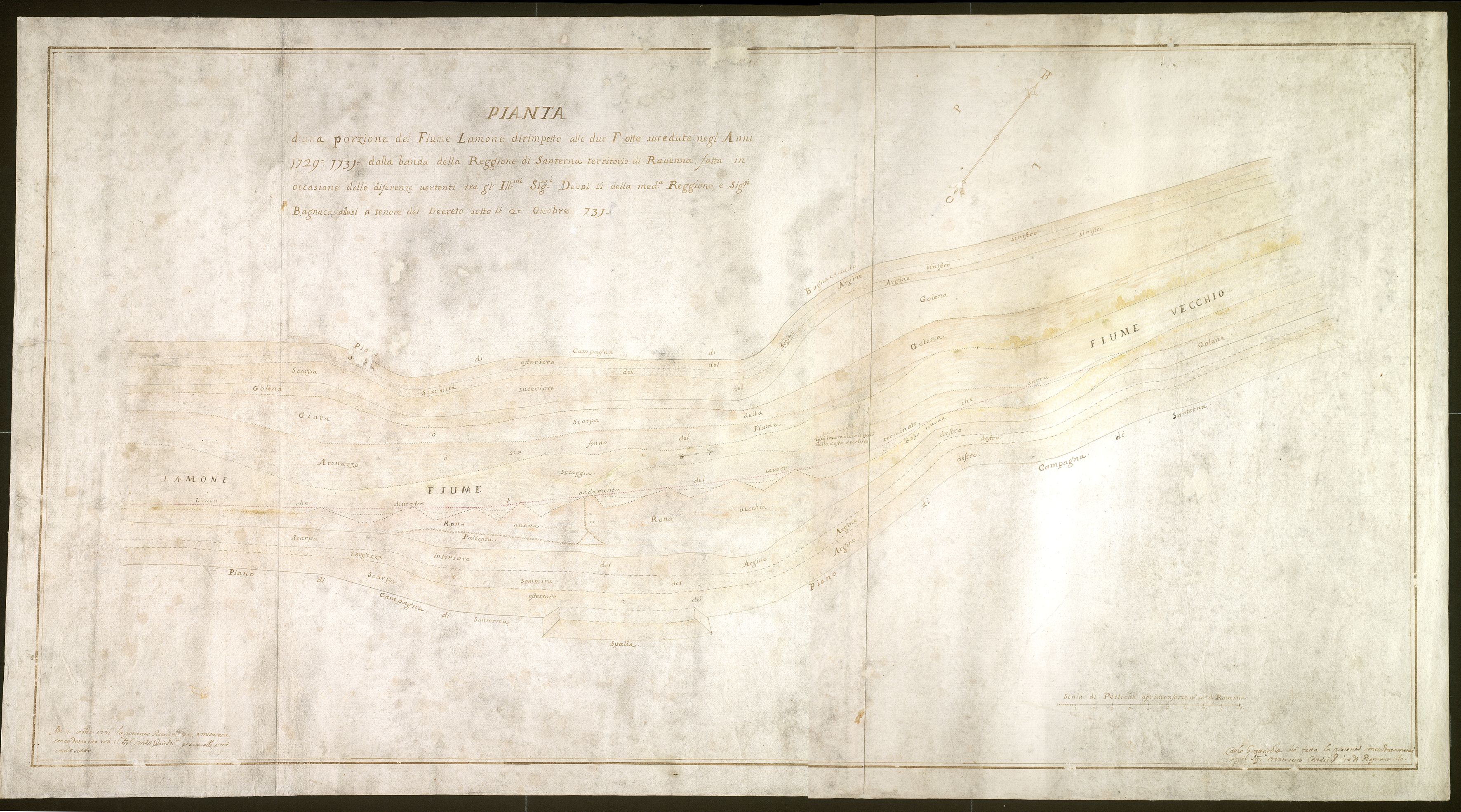 Pianta di una porzione del fiume Lamone rispetto alle due rotte sucedute negli anni 1729 - 1731 dalla banda della reggione di Santerna territorio di Ravenna fatta in occasione delle diferenze vertenti tra gli Illustrissimi Signori Deputati della medesima reggione e Signori Bagnacavallesi a tenore del Decreto sotti li 2 ottobre 1731