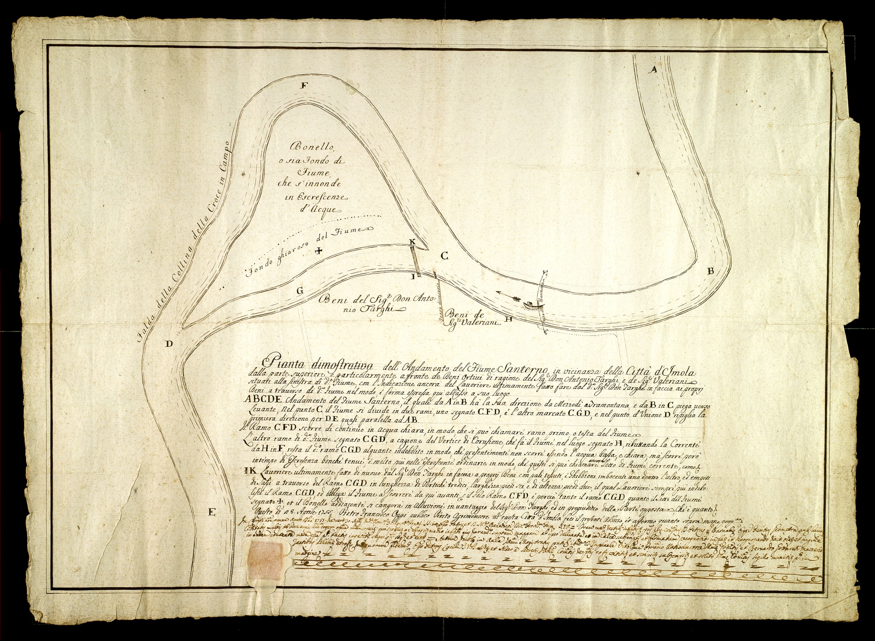 Pianta dimostrativa dell'andamento del fiume Santerno in vicinanza della città di Imola dalla parte superiore e particolarmente a fronte de beni ortivi di ragione del Sig. don Antonio Targhi e de Signori Valeriani situati alla sinistra di detto fiume ...