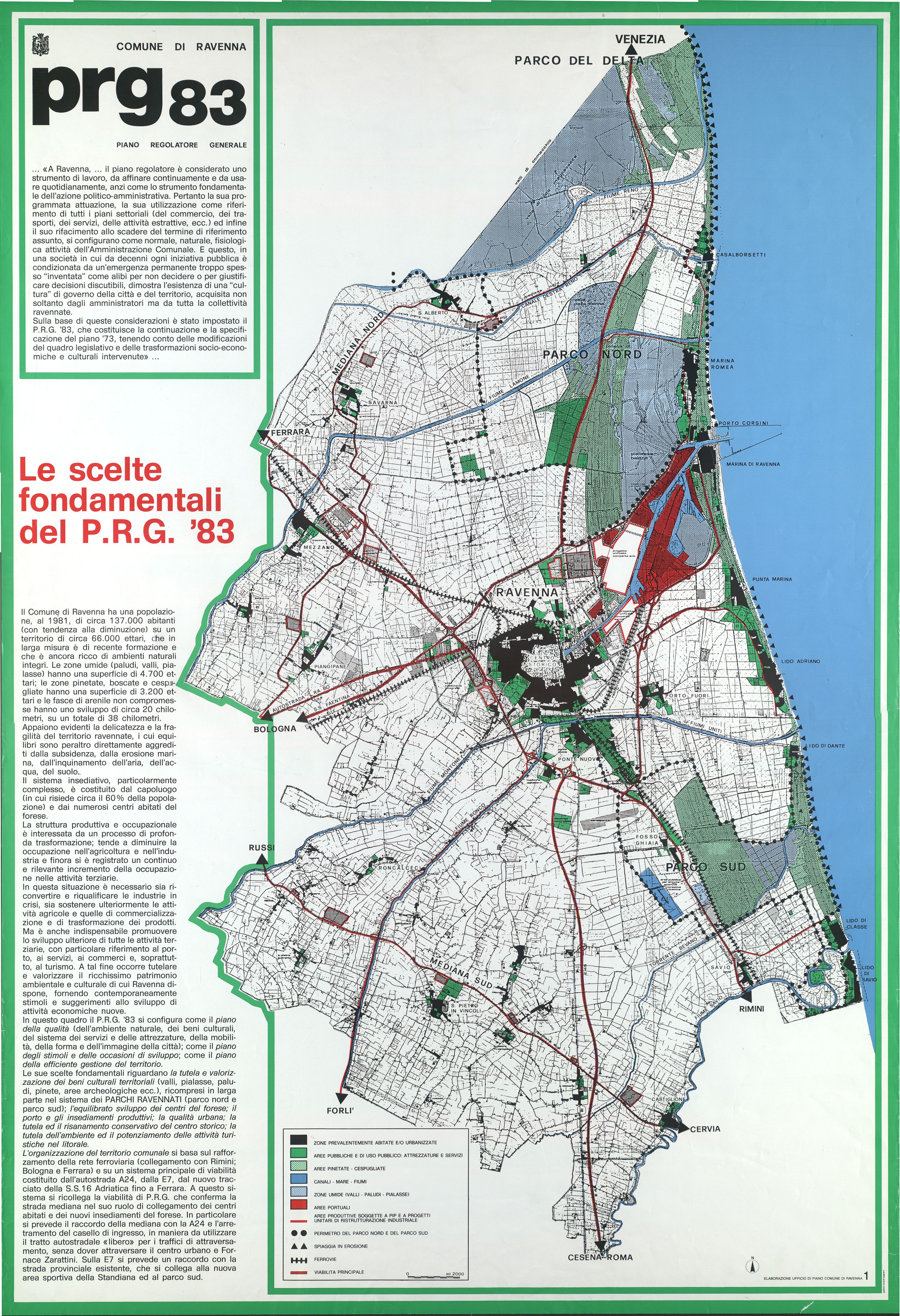 7 manifesti: offset; 100x70 cm. ((Le scelte fondamentali del PRG '83; Le scelte di piano: il porto e gli insediamenti produttivi per lo sviluppo dell'economia ravennate; Le scelte di piano: la qualità urbana, il sistema dei luoghi centrali, la residenza, i servizi sociali; Le scelte di piano: tutela e risanamento conservativi del centro storico; Le scelte di piano: tutela dell'ambiente e potenziamento dell'ambiente delle attività turistiche sul litorale.