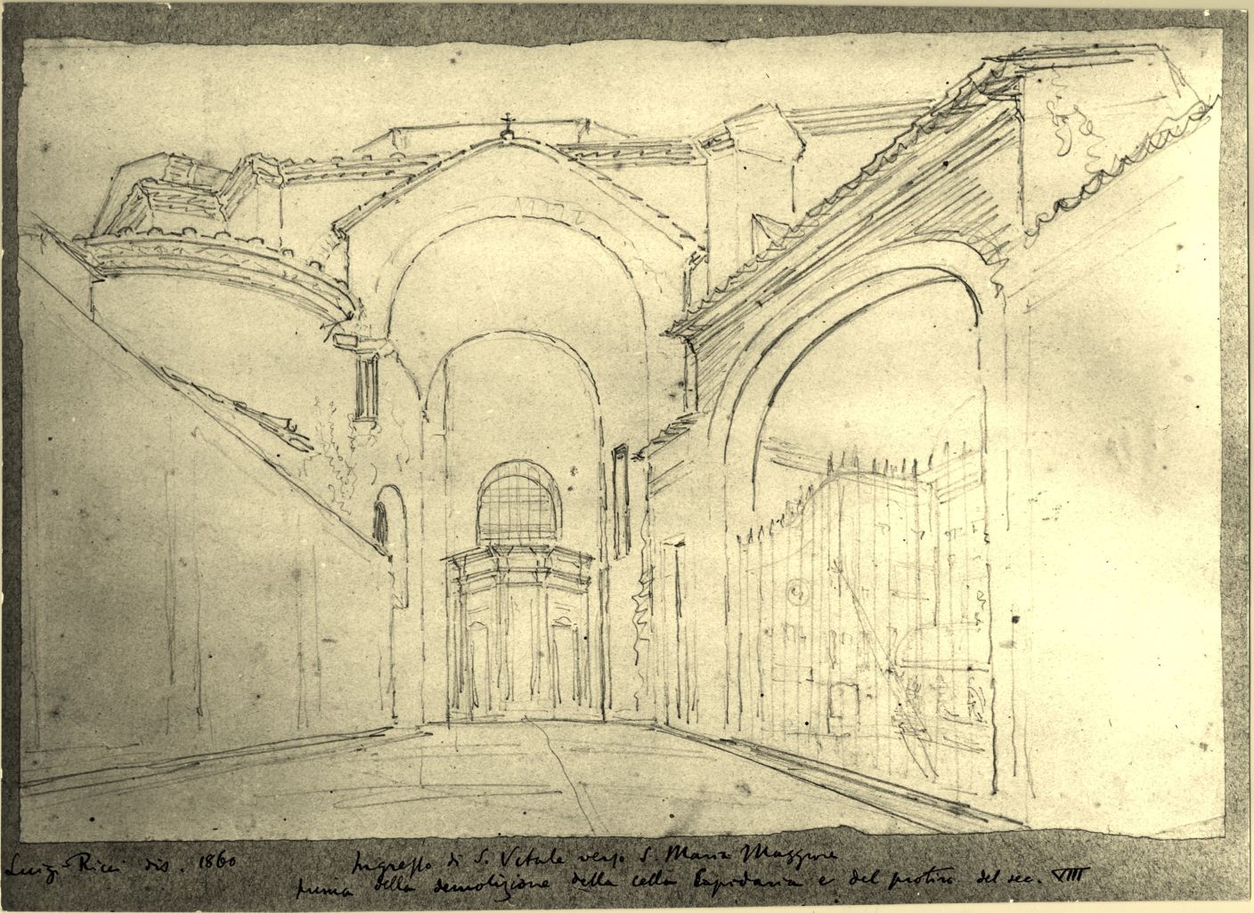 Disegno dell'ingresso di S. Vitale verso S. Maria Maggiore prima della demolizione della cella lapidaria e del portico del sec. 13., di Luigi Ricci,1860