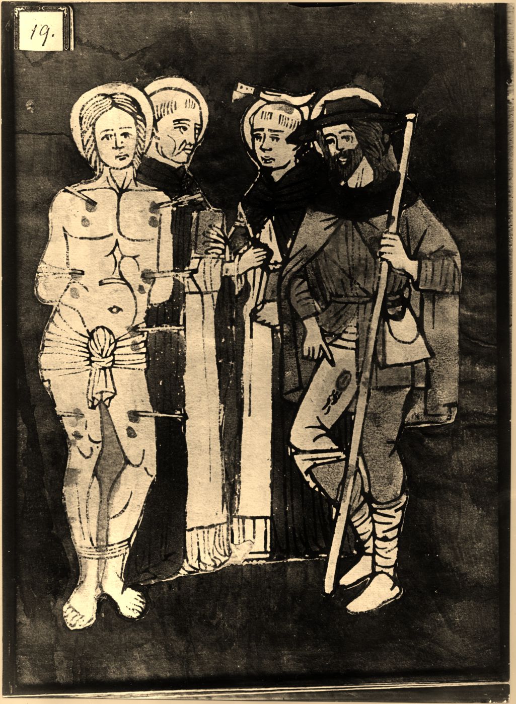 Biblioteca Classense: xilografia che rappresenta S. Sebastiano, S. Vincenzo Ferrier, S. Pietro martire e S. Rocco dal codice 485