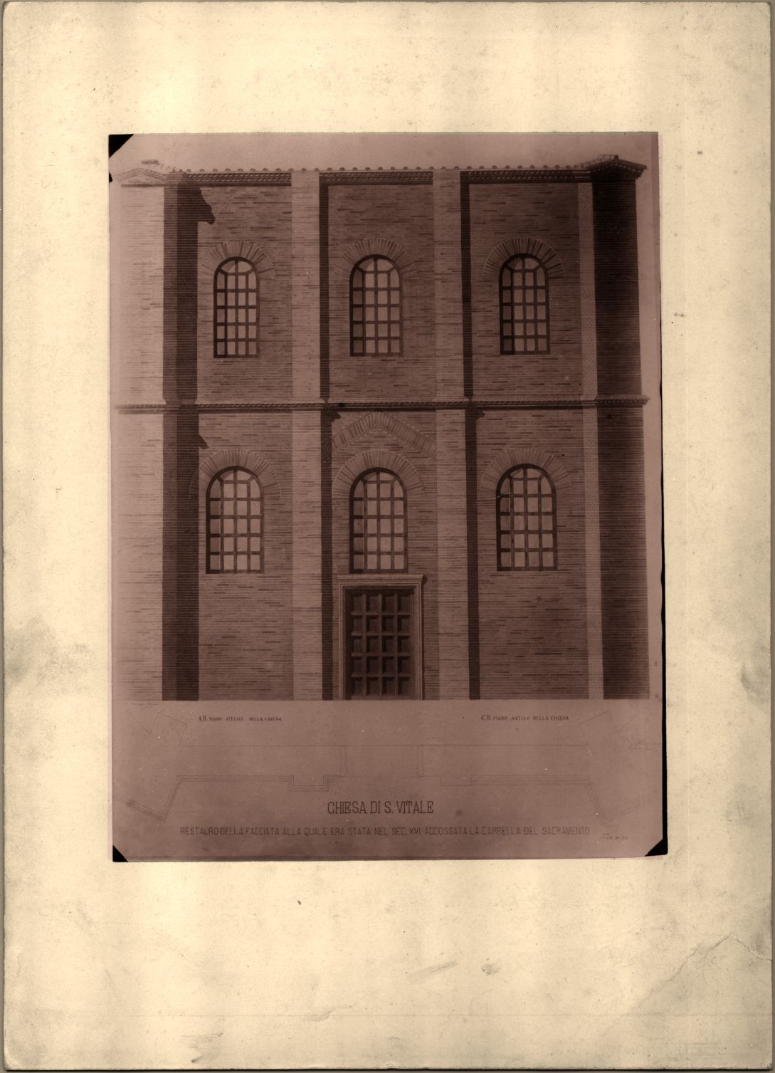 Disegno di Azzaroni del restauro della facciata alla quale era stata nel Sec. 16. addossata la Cappella del Sacramento nella basilica di S. Vitale a Ravenna