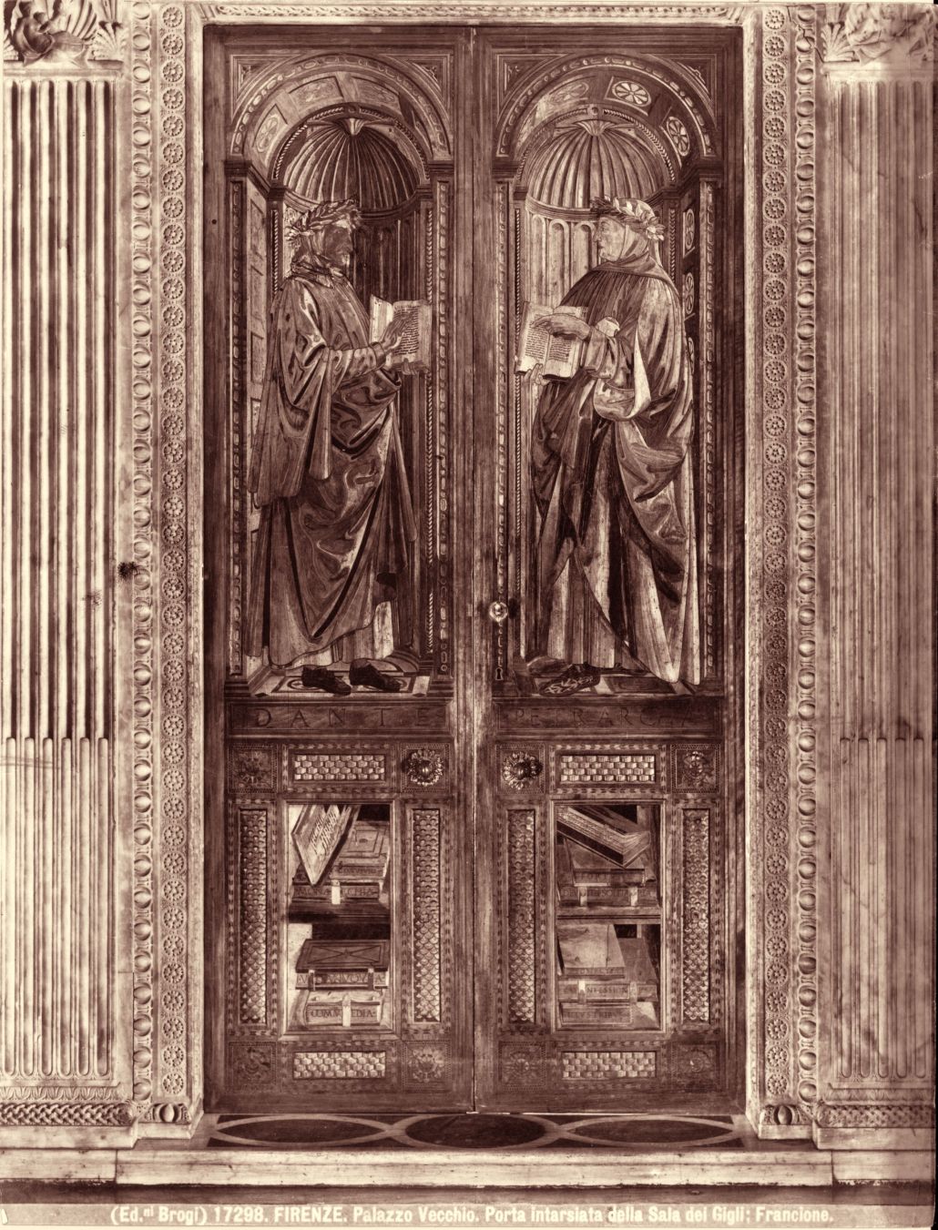 Iconografia dantesca. Firenze : Palazzo Vecchio : porta intarsiata della Sala dei Gigli di Francione