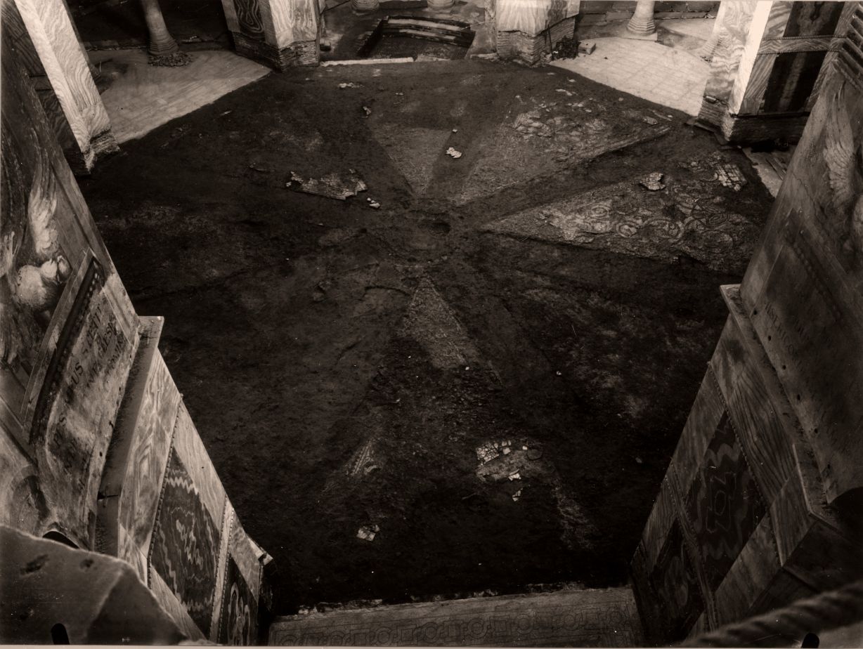 Lavori di restauro sul mosaico del pavimento all'ingresso di S. Vitale a Ravenna