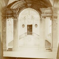 Il progetto per il nuovo atrio si dovette a Giuseppe Antonio Soratini: i lavori iniziarono dopo quelli per la biblioteca e insieme all’architetto lavorò la stessa, collaudata squadra di artefici reclutati per le opere precedenti. Tra il 1714 e il 1716 si terminò lo scalone e vennero realizzati il monumento a Canneti e la porta lignea.