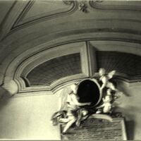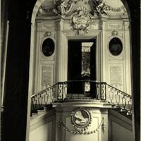 Alla base dello scalone è presente un bassorilievo, forse dovuto al progetto di Morigia: il sole illumina un libro aperto, probabili simboli di un percorso illuminato dalla luce divina e reso possibile dalla lettura.