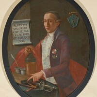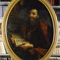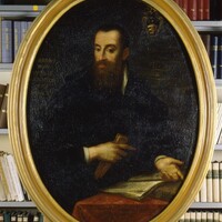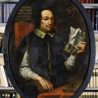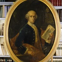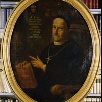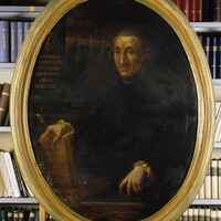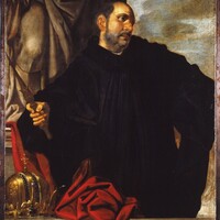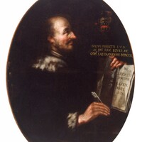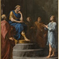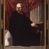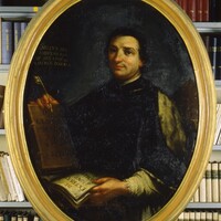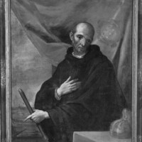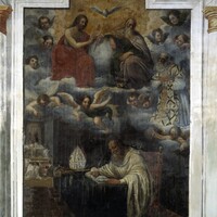 San Benedetto in trono porge la Regola ai Santi Placido e Mauro, attorniati da altri discepoli |