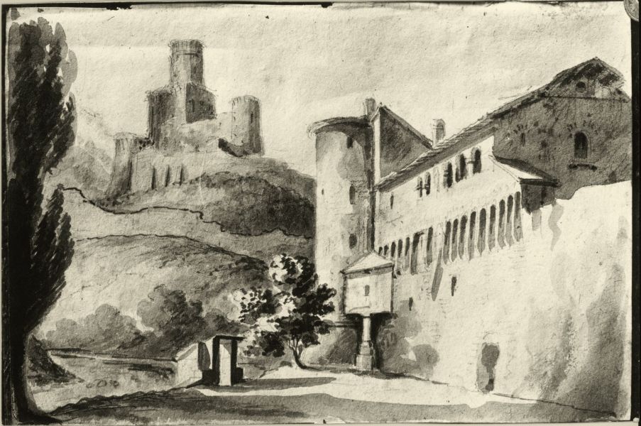 Disegno di Modigliana vista da fiume Isola : il marchio che si vede e il loggiato esistono ancora