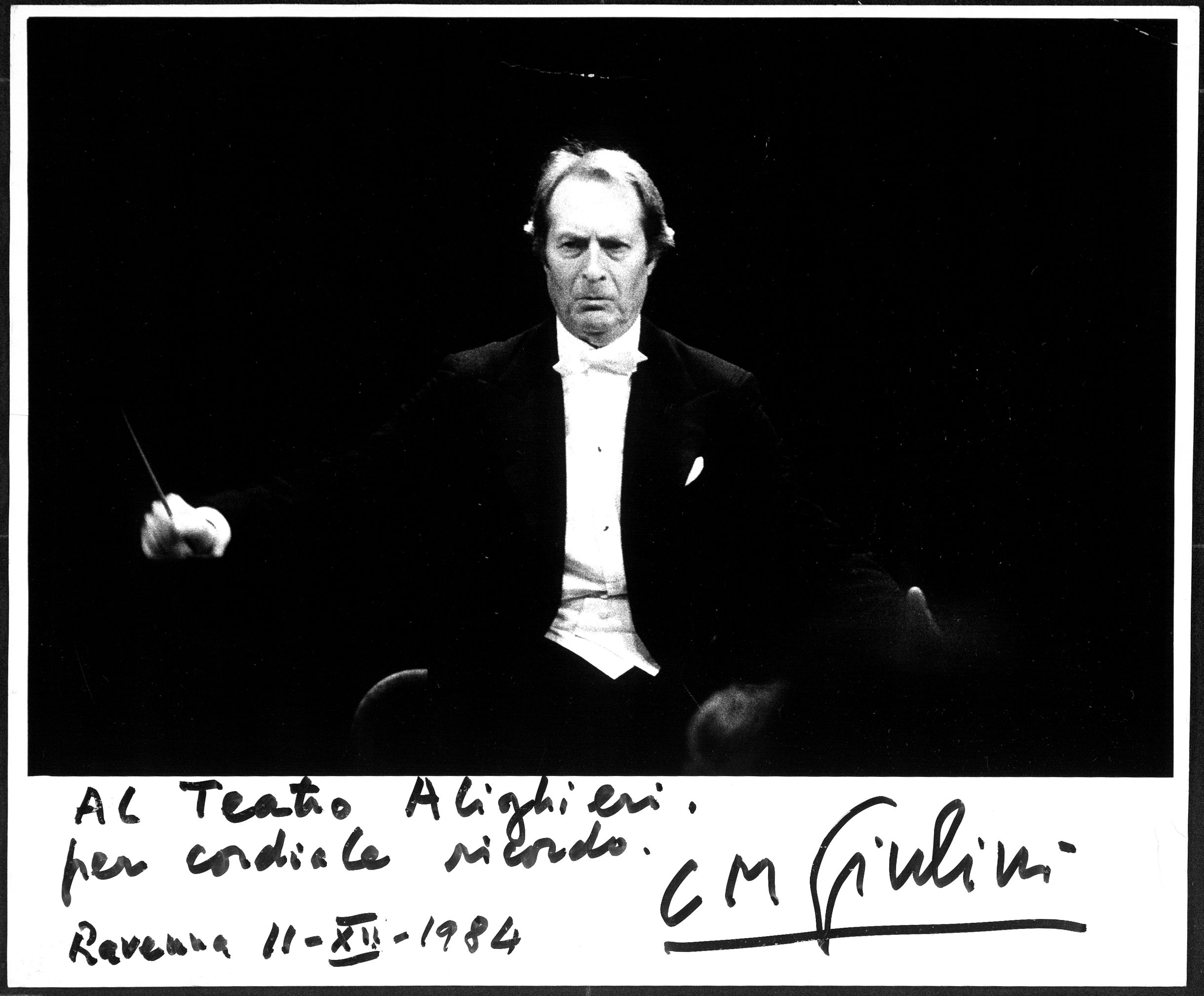 Sul recto: dedica autografa di Giulini "Al Teatro Alighieri, per cordiale ricordo", Ravenna 11.XII. 1984