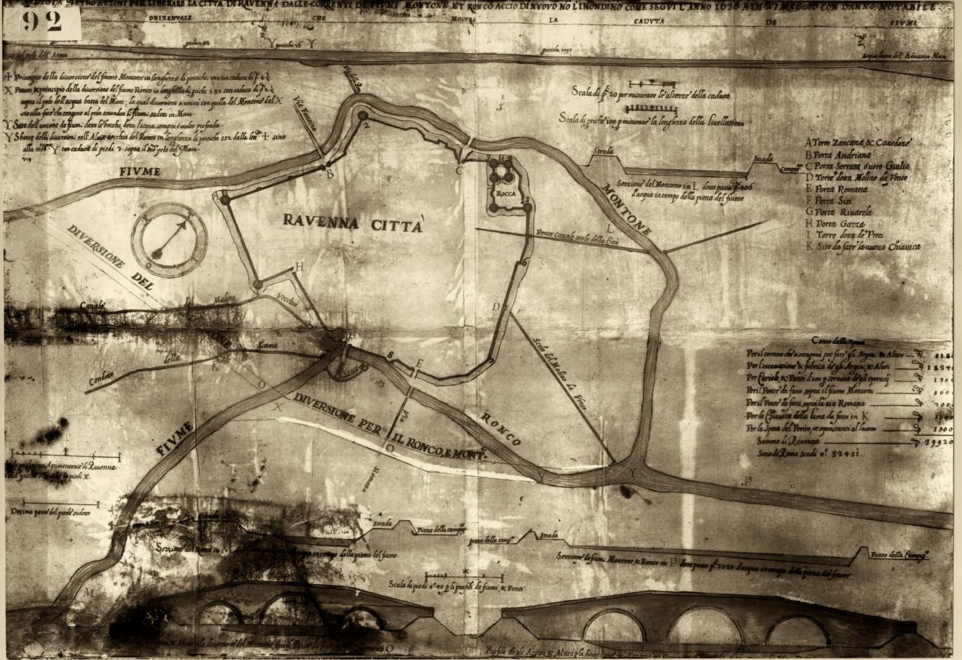 Pianta dei lavori per liberare la città di Ravenna dalle correnti dei fiumi Ronco e Montone dopo l’inondazione dell’anno 1636, dep. Archivio di Stato di Roma