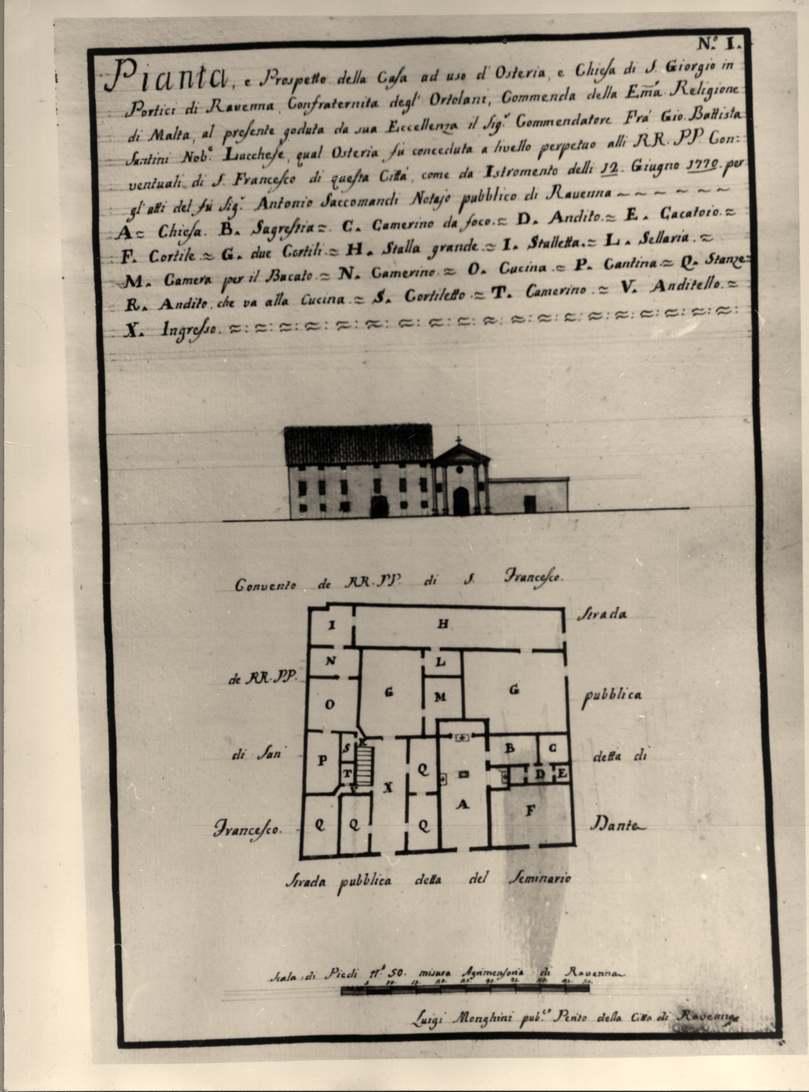 Pianta a prospetto della casa ad uso osteria e della Chiesa di S. Giorgio a Ravenna : 1783 : Confraternita di S. Giorgio, vol. 2343