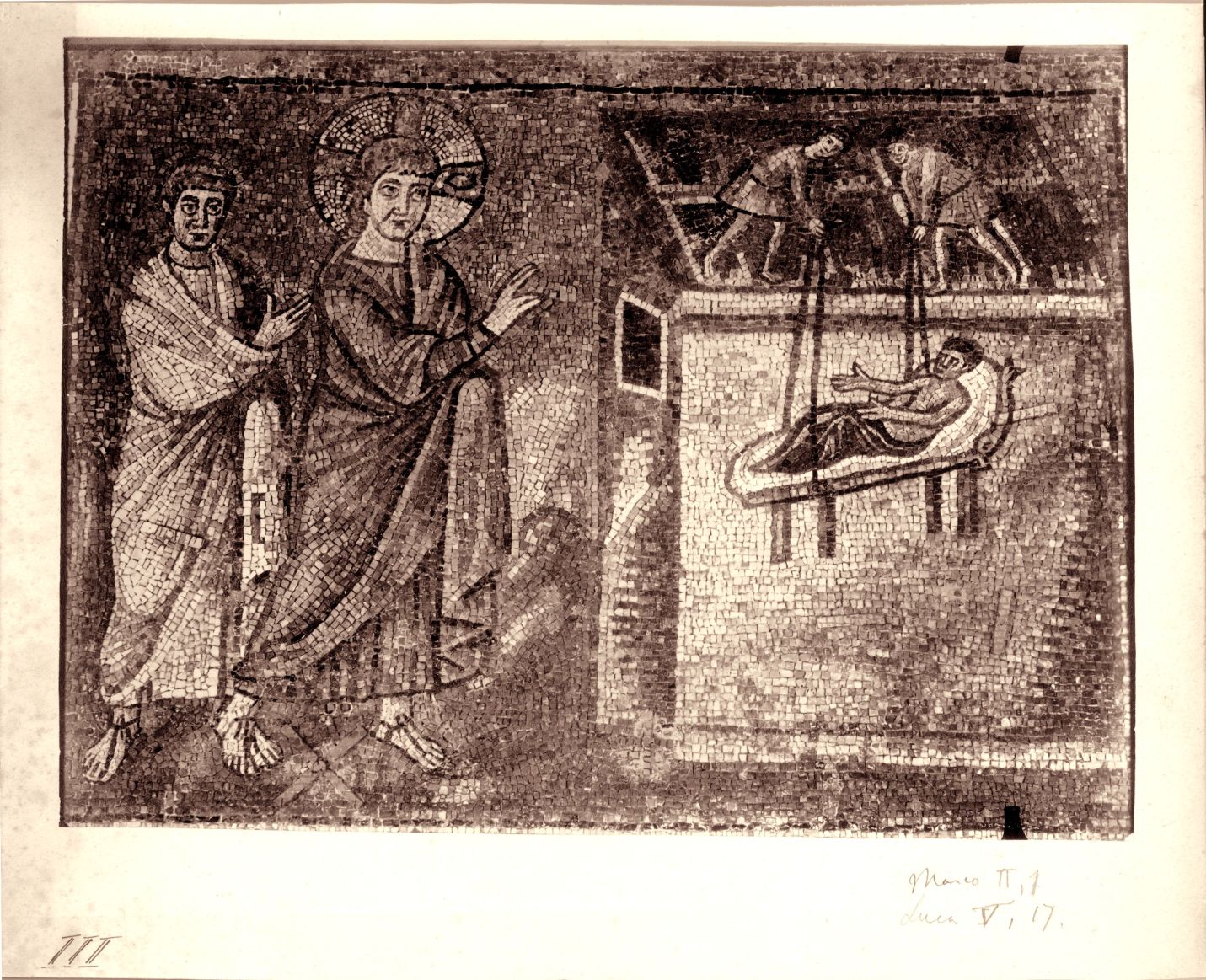 Ravenna : musaici di S. Apollinare Nuovo : quadri con episodi della vita di Gesù : il malato messo sul tetto : Marco II, 1, Luca V, 17