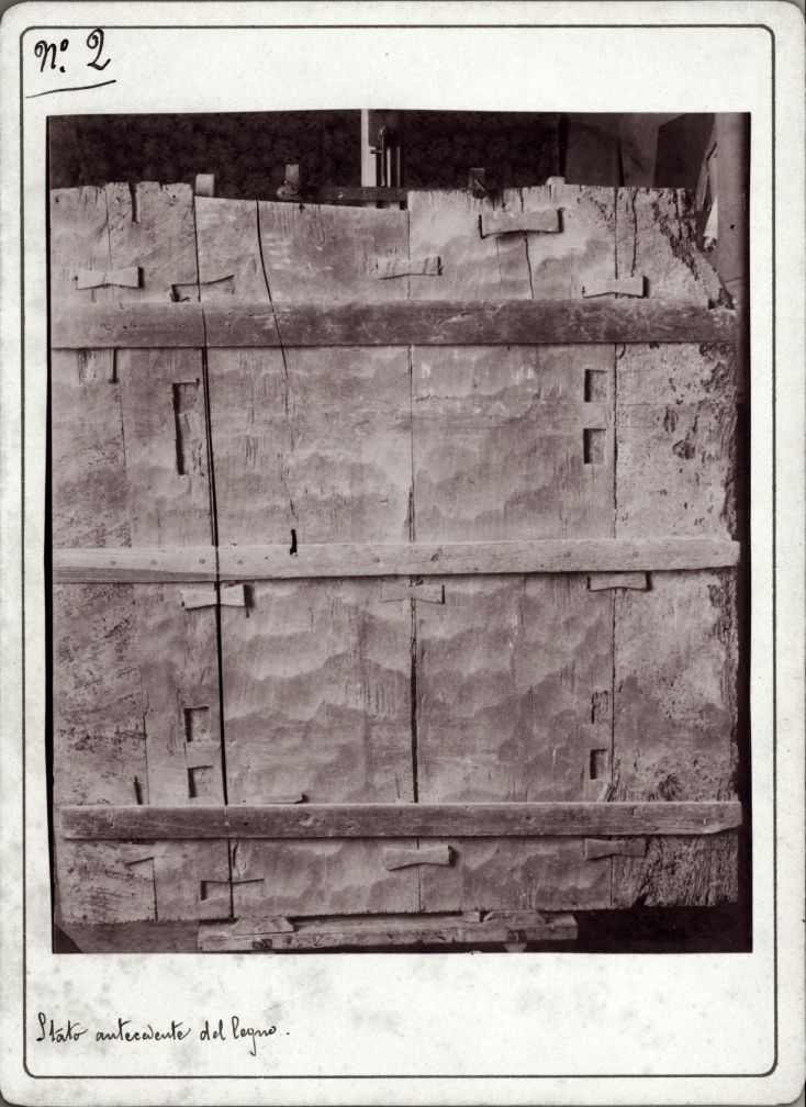 Ravenna : Palazzo dell'Arcivescovado : retro della tavola di Marco Palmezzani con Madonna e il Putto fra le ss. Barbara e Caterina antecedente le riparazioni