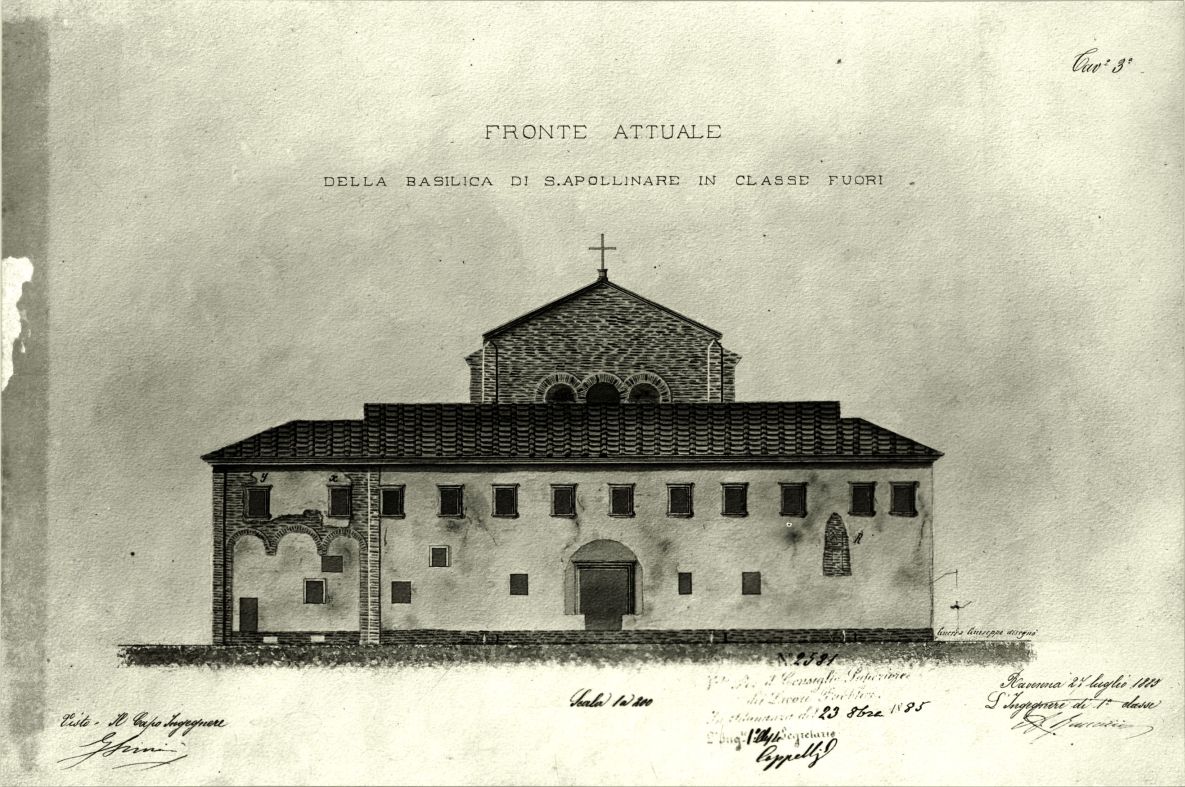 Disegno del fronte attuale della Basilica di S. Apollinare in Classe fuori di A. Baccarini eseguito nel 1885, disegno presso la Direzione generale delle antichità