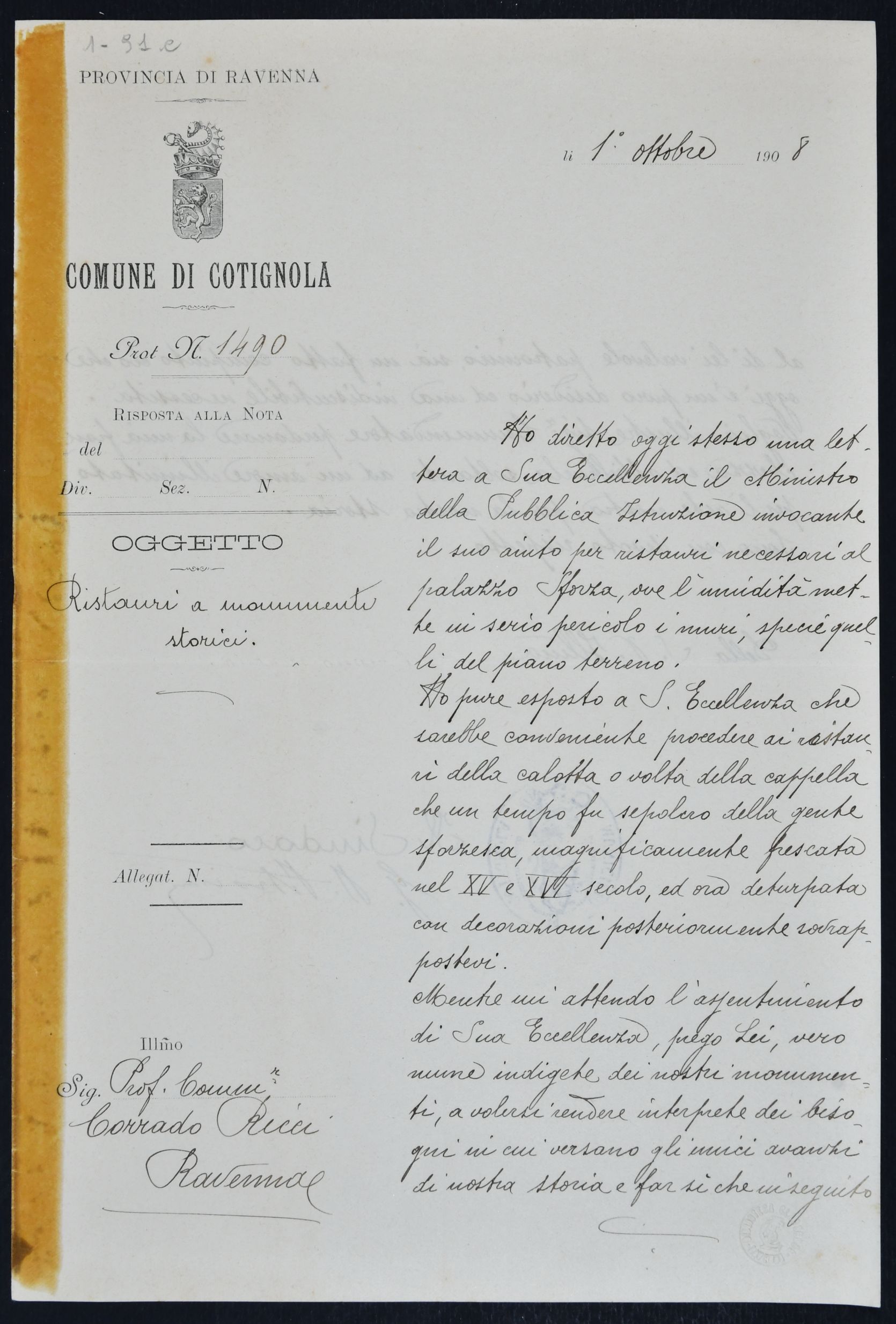 Ricevuta la di Lei gentilissima, sento l'obbligo di porgerle i più vivi ringraziamenti per il cortese interessamento che Ella prende alla sorte dei nostri monumenti. [...] |