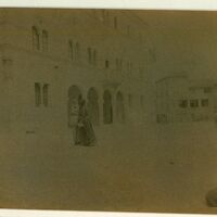 Veduta di piazza con palazzo, persone che passeggiano e cane che dorme |