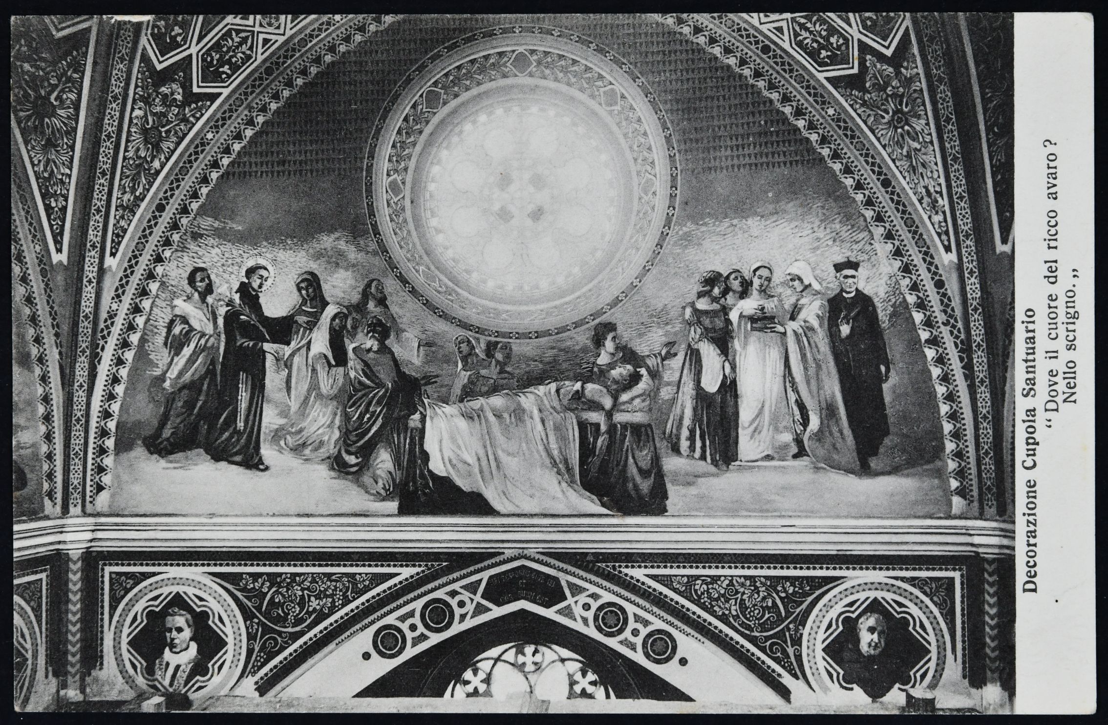 Decorazione cupola santuario. "Dove il cuore del ricco avaro? Nello scrigno."