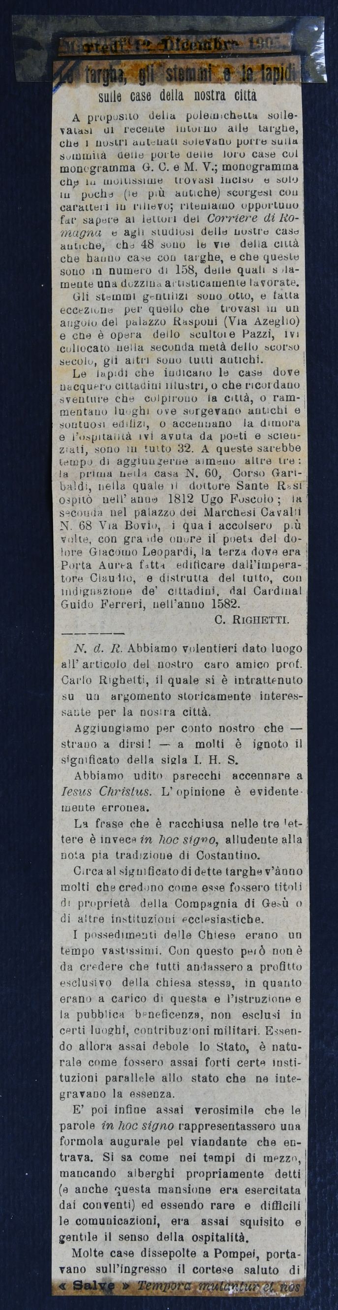 A proposito di targhe votive nelle antiche case di Ravenna |