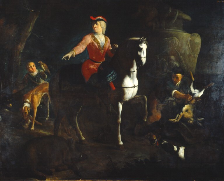 Ritorno dalla caccia con figura di donna a cavallo, valletto con falco, assistente con cacciagione, cani