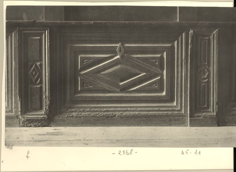 Vercelli, Abbazia di S. Andrea : particolare del sedile in legno del coro della Sala capitolare (1544?)