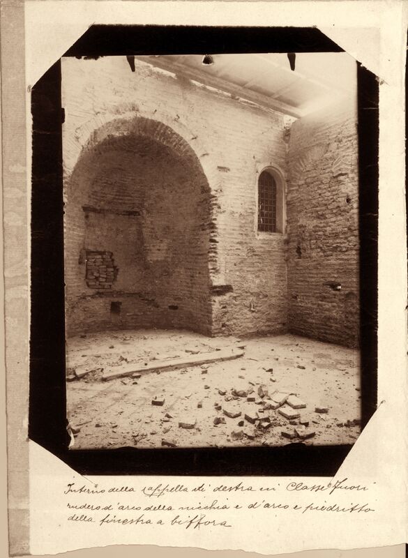 Ravenna : interno della Cappella di destra in Classe fuori : rudere d’arco della nicchia e d’arco e piedritto della finestra a bifora