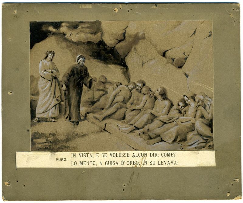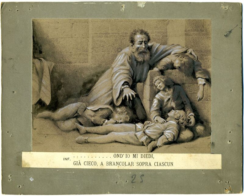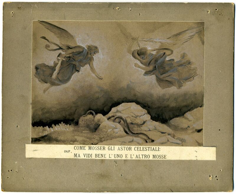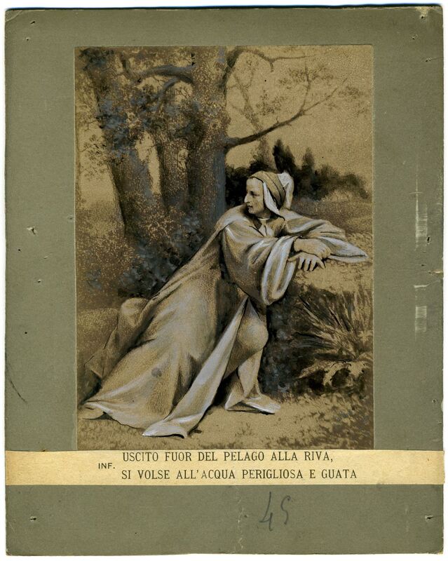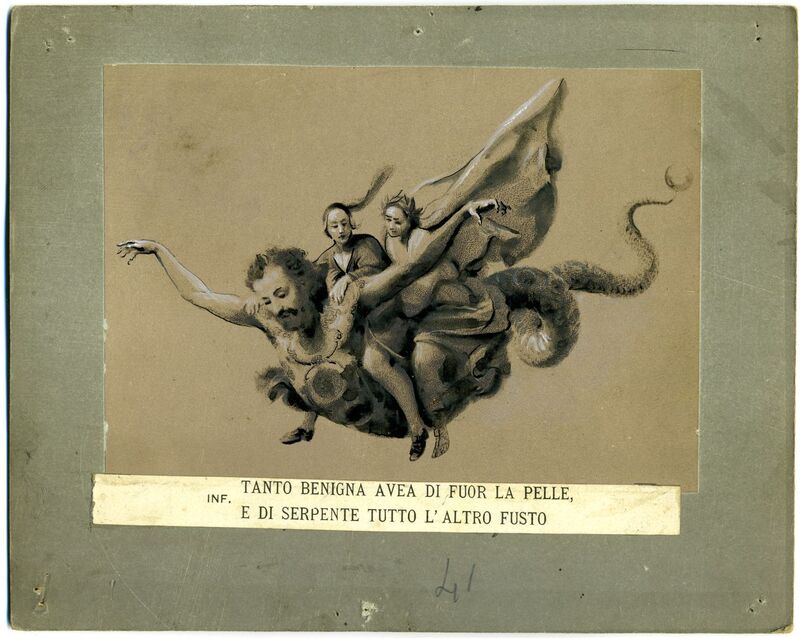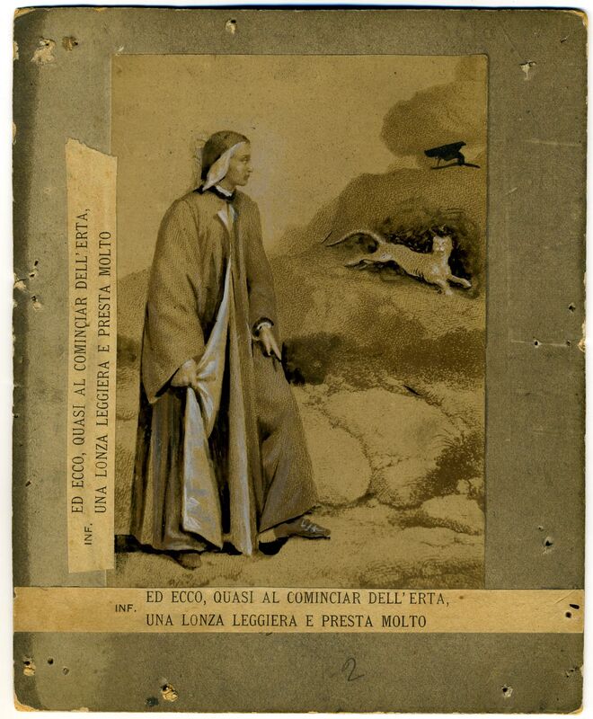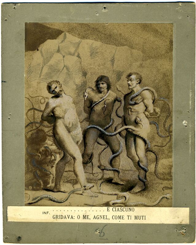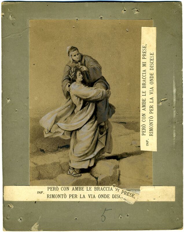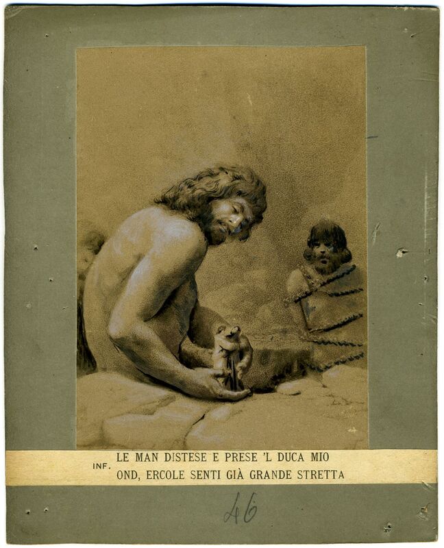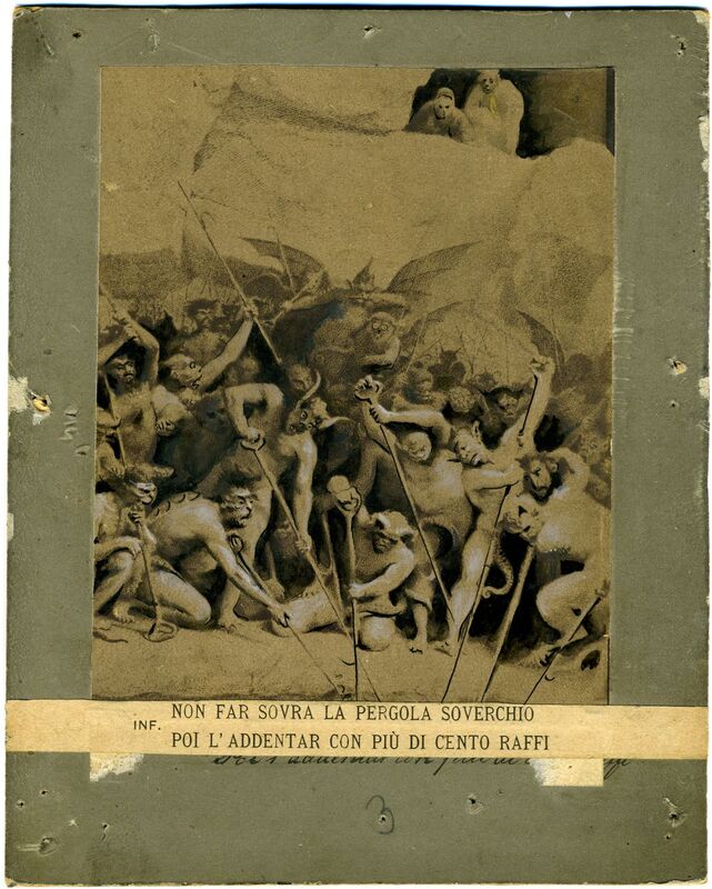Il fondo è composto da 50 albumine, individualmente incollate su un supporto rigido in cartoncino, e corredate da didascalie riportanti i versi danteschi cui l’illustrazione fa riferimento. Da notare la presenza di piccole correzioni, punti di luce e ombre, aggiunti a matita successivamente alla stampa delle fotografie stesse. Il buono stato di conservazione delle stampe permette a noi oggi di comprendere l’importante ruolo della fotografia come strumento a buon mercato di riproduzione delle grandi opere d’arte, che in questo modo potevano raggiungere un più ampio pubblico.