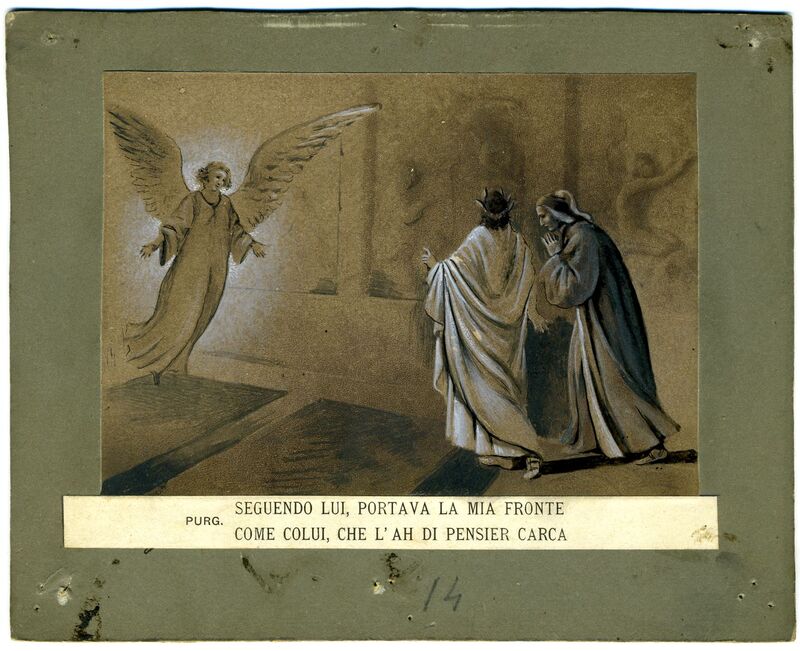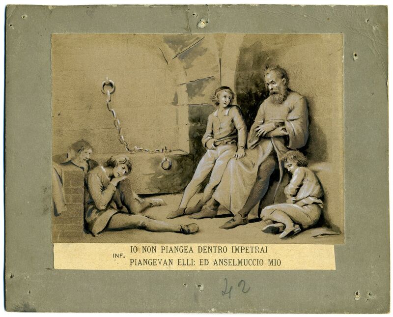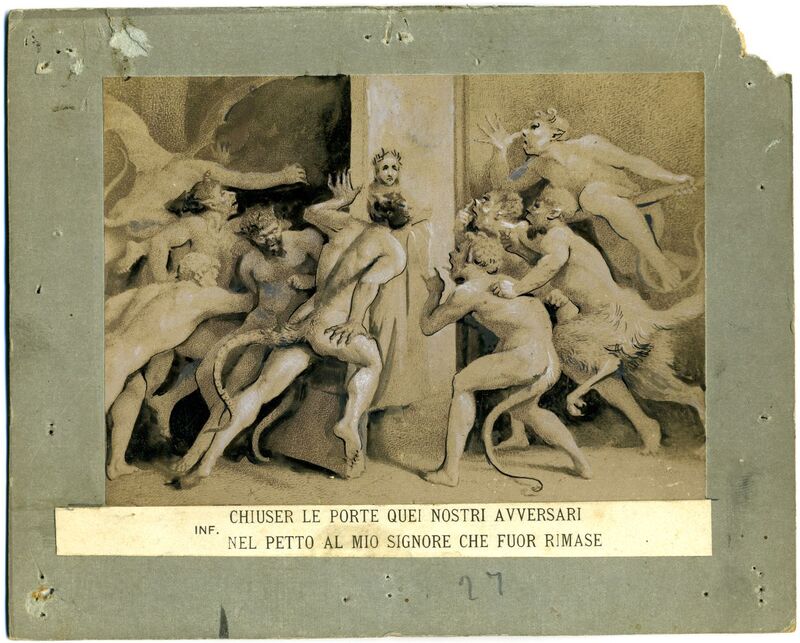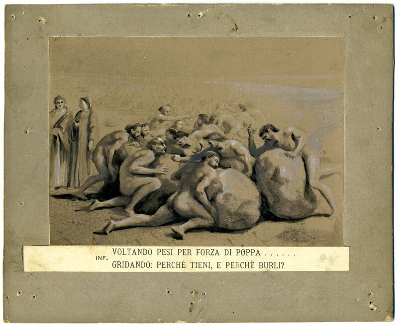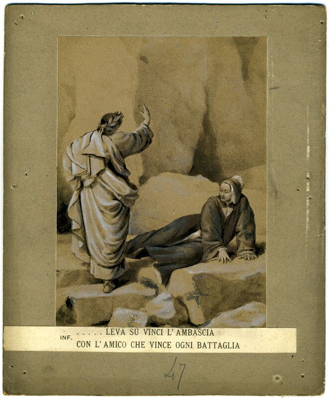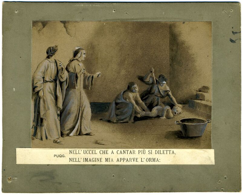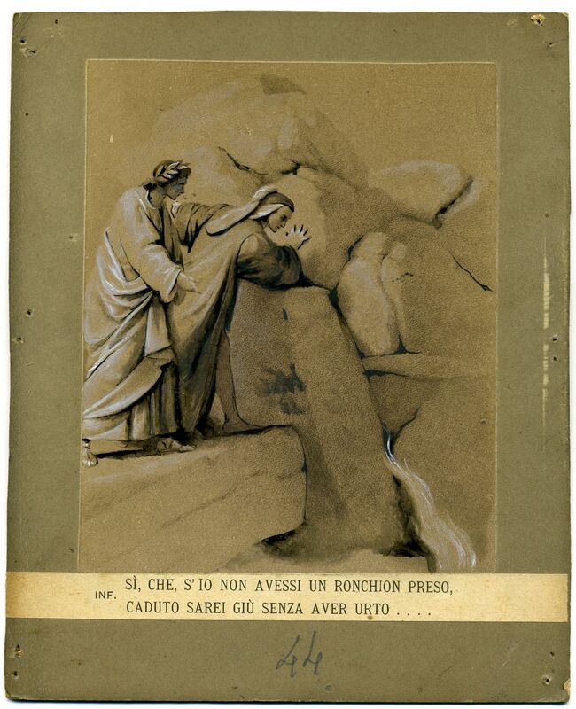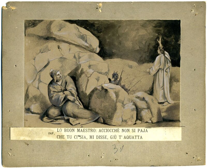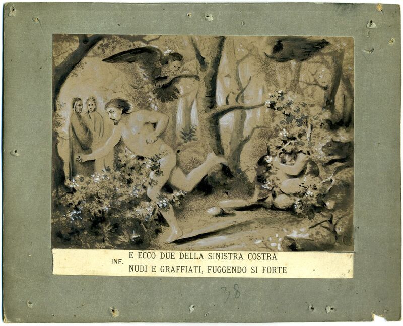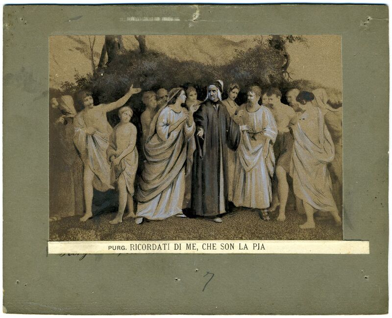 Il fondo è composto da 50 albumine, individualmente incollate su un supporto rigido in cartoncino, e corredate da didascalie riportanti i versi danteschi cui l’illustrazione fa riferimento. Da notare la presenza di piccole correzioni, punti di luce e ombre, aggiunti a matita successivamente alla stampa delle fotografie stesse. Il buono stato di conservazione delle stampe permette a noi oggi di comprendere l’importante ruolo della fotografia come strumento a buon mercato di riproduzione delle grandi opere d’arte, che in questo modo potevano raggiungere un più ampio pubblico.