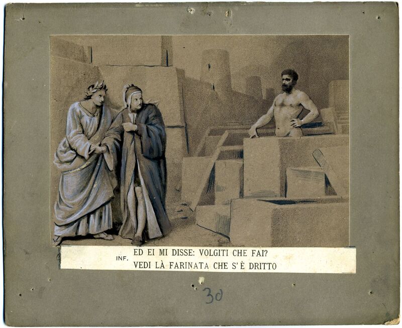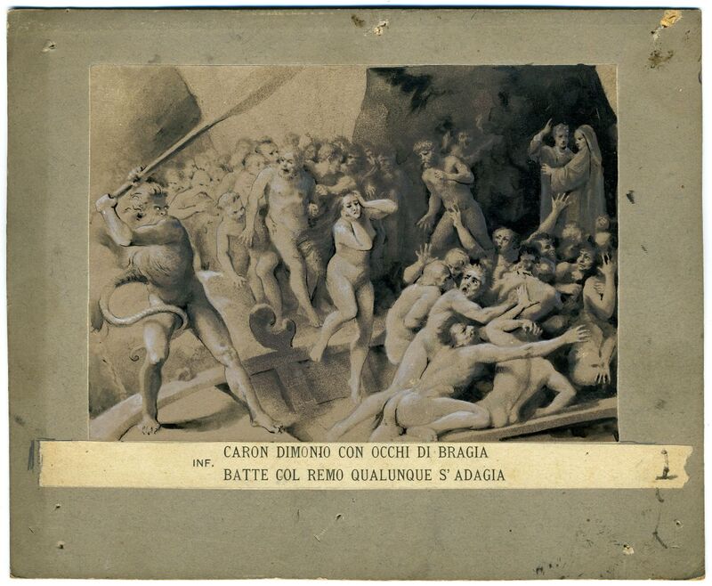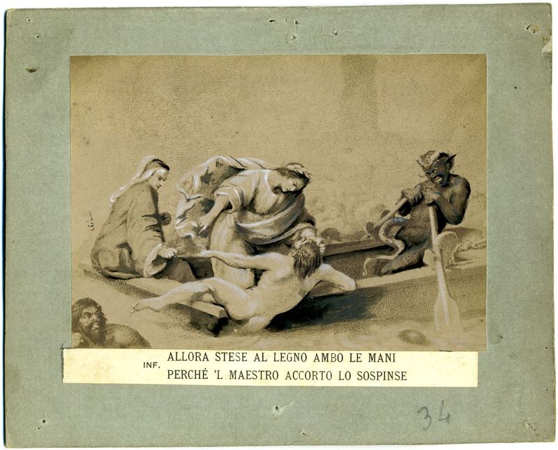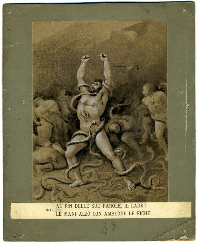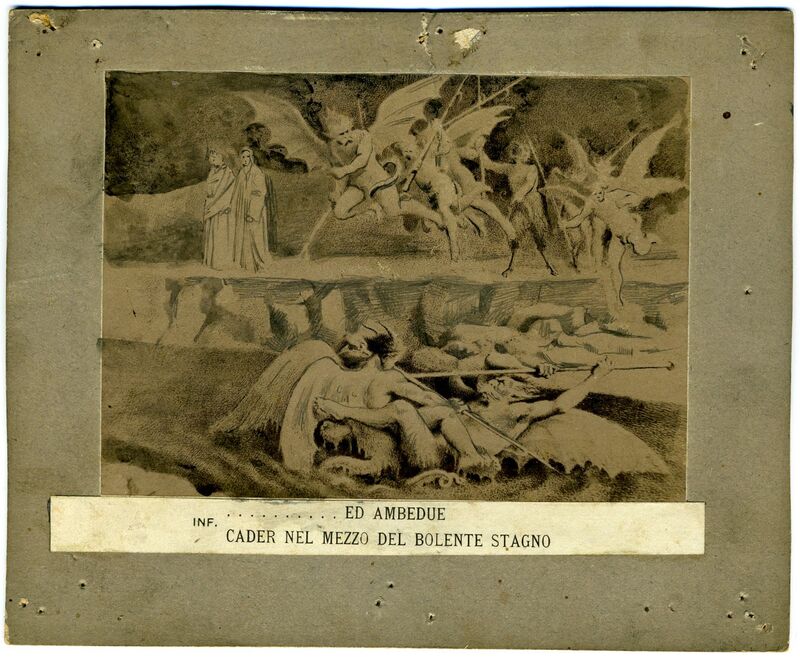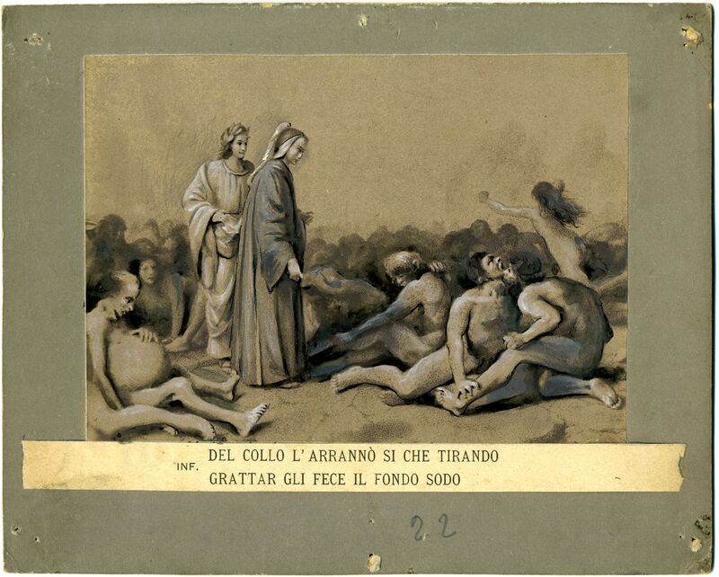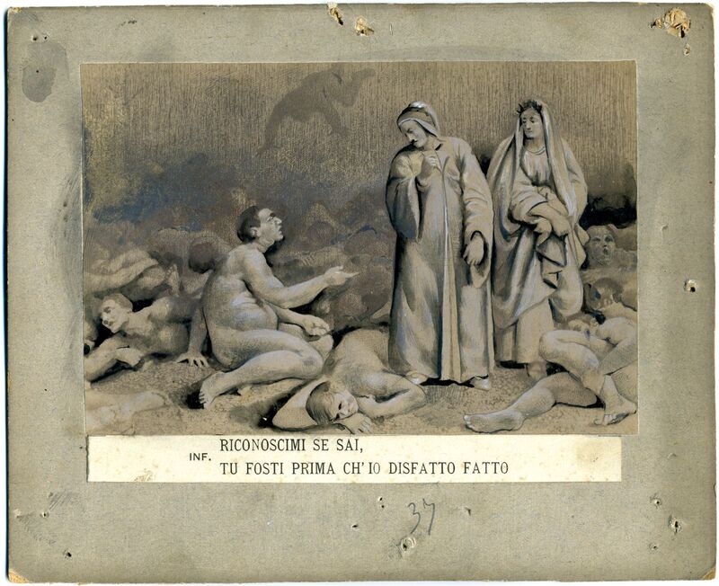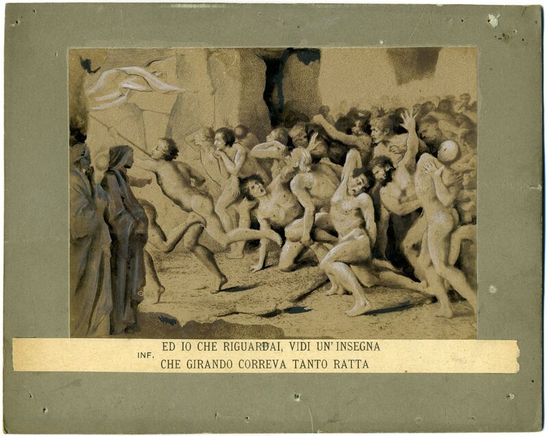 Il piccolo corpus fotografico, denominato “Iconografia dantesca”, è formato da 50 riproduzioni fotografiche delle tavole create dall’artista parmense Francesco Scaramuzza come illustrazione alla Divina Commedia di Dante Alighieri. Considerato tra i più importanti illustratori dell’opera dantesca, Scaramuzza fu a lungo messo in ombra dall’artista francese Gustave Doré, le cui illustrazioni della Commedia furono pubblicate solo pochi anni dopo.