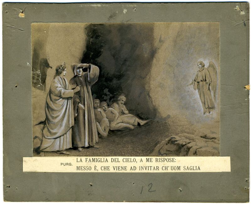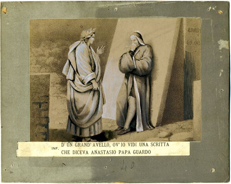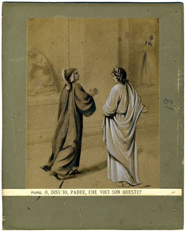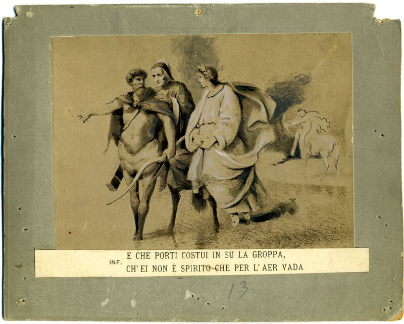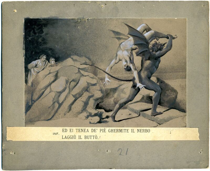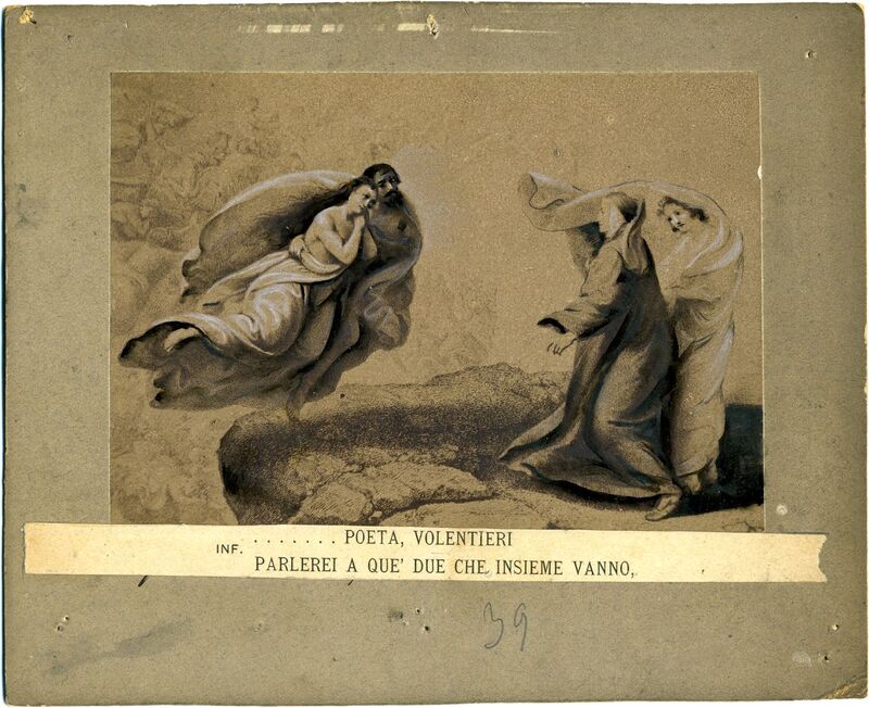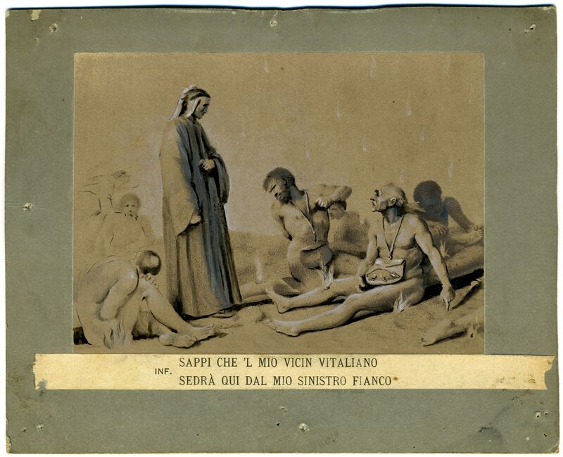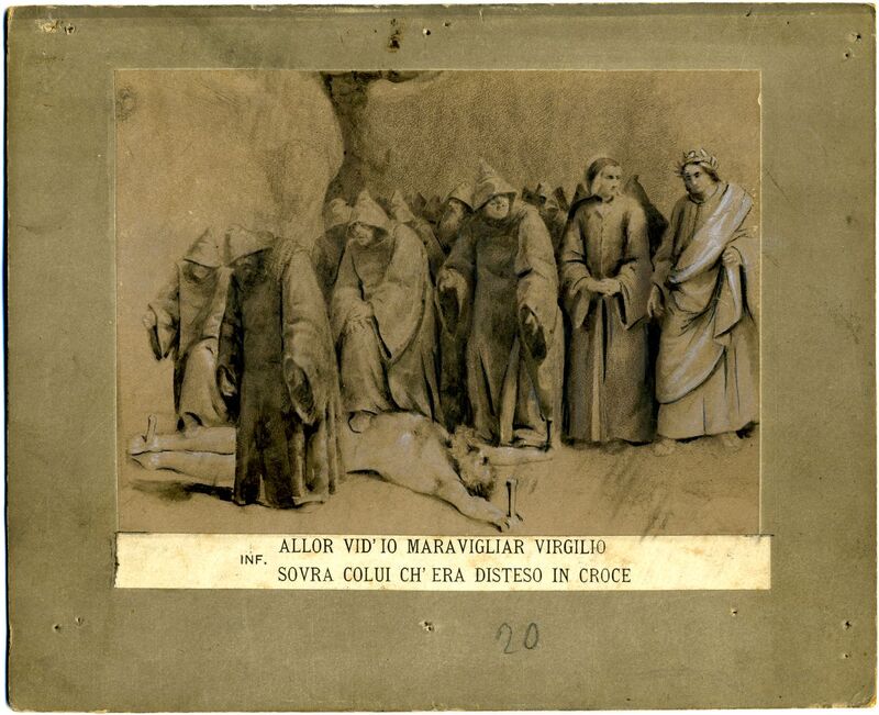 Il piccolo corpus fotografico, denominato “Iconografia dantesca”, è formato da 50 riproduzioni fotografiche delle tavole create dall’artista parmense Francesco Scaramuzza come illustrazione alla Divina Commedia di Dante Alighieri. Considerato tra i più importanti illustratori dell’opera dantesca, Scaramuzza fu a lungo messo in ombra dall’artista francese Gustave Doré, le cui illustrazioni della Commedia furono pubblicate solo pochi anni dopo.