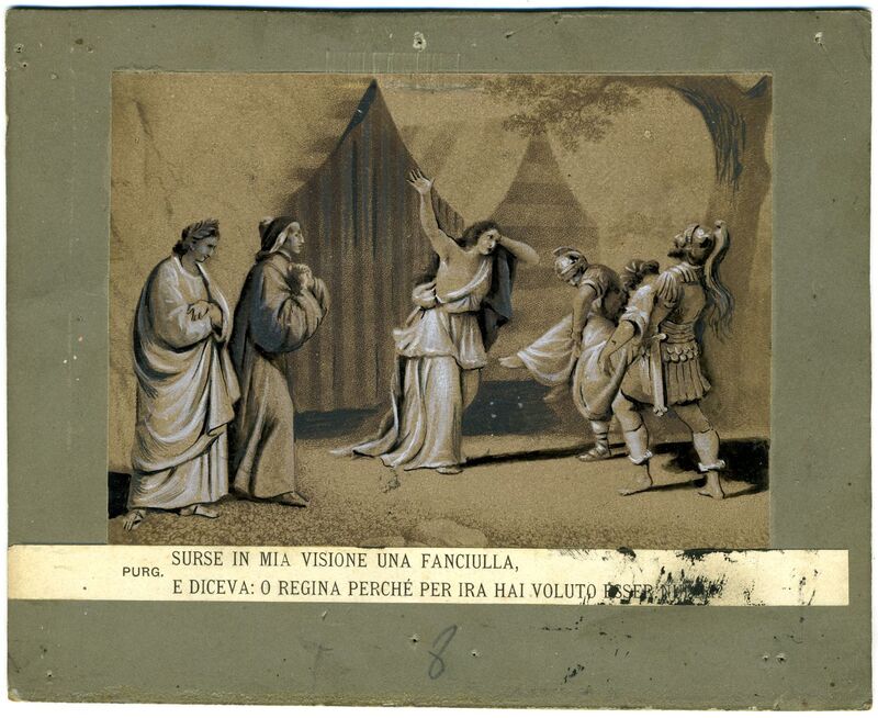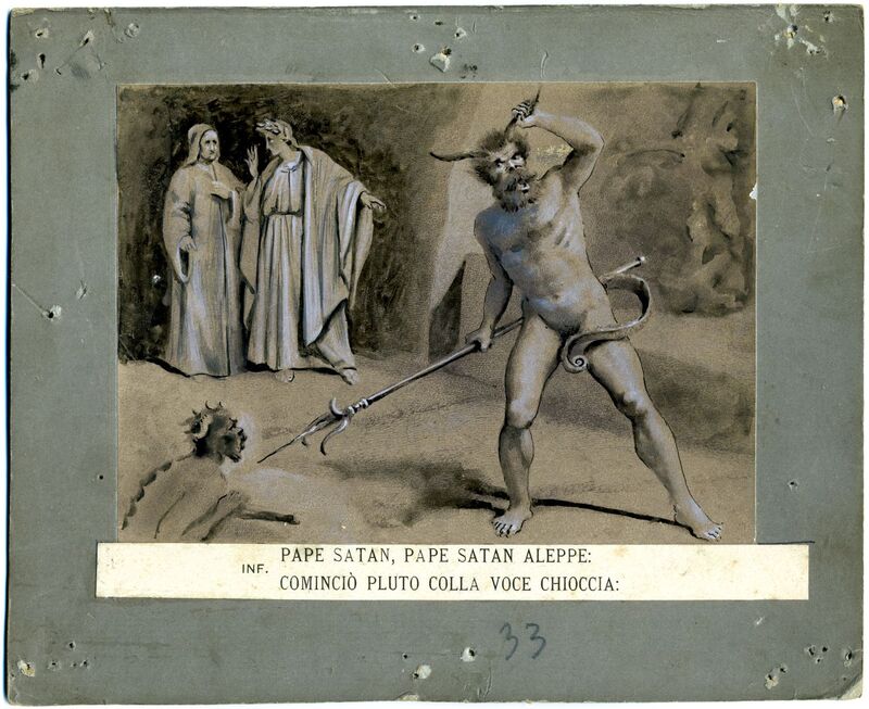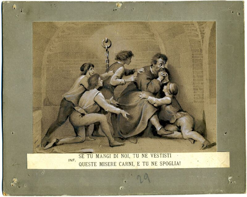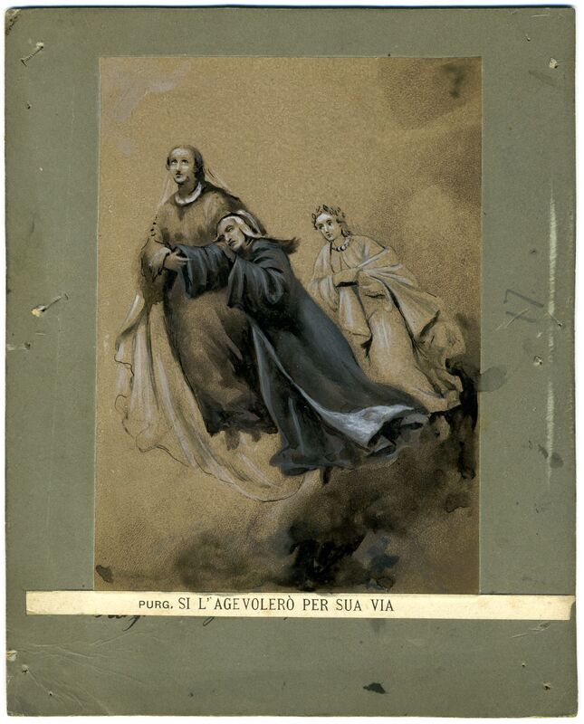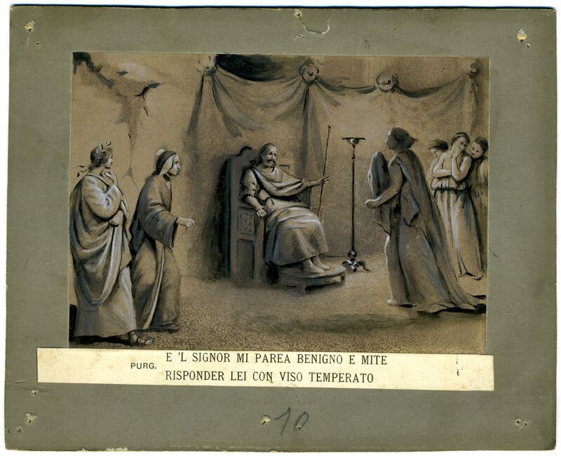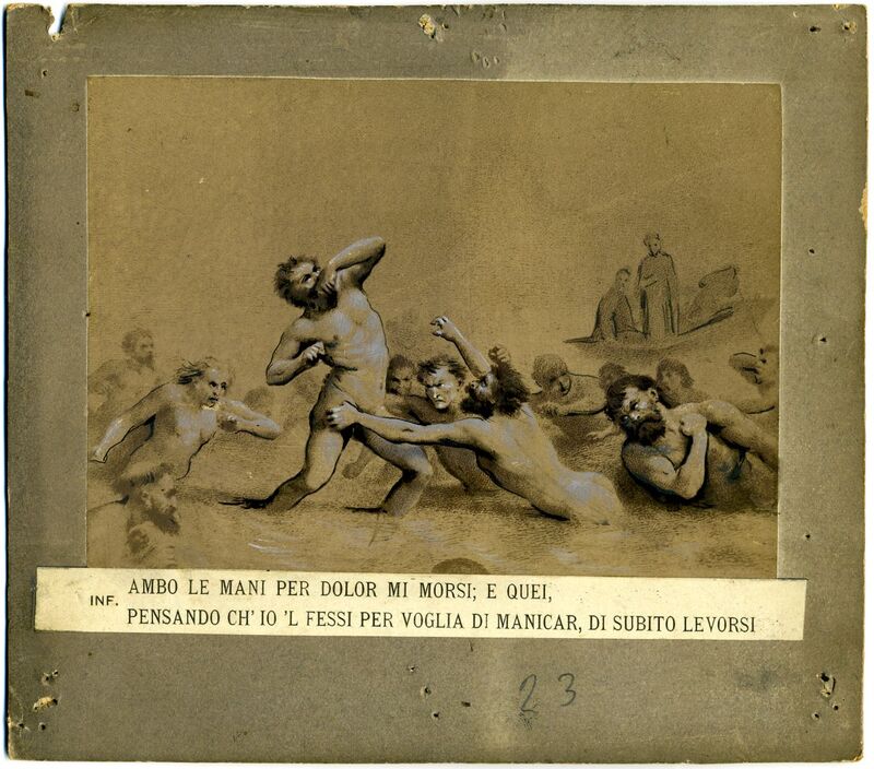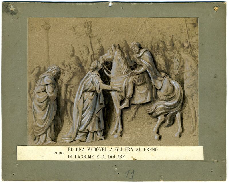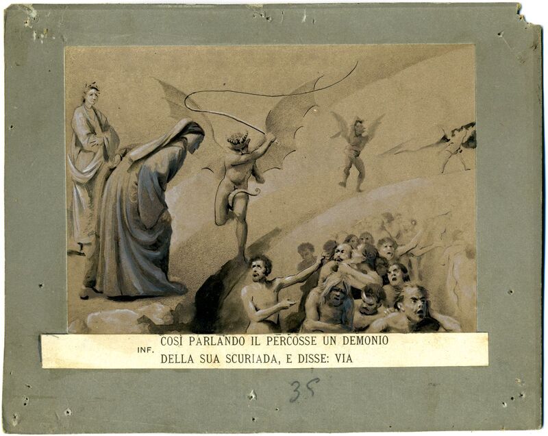 Il piccolo corpus fotografico, denominato “Iconografia dantesca”, è formato da 50 riproduzioni fotografiche delle tavole create dall’artista parmense Francesco Scaramuzza come illustrazione alla Divina Commedia di Dante Alighieri. Considerato tra i più importanti illustratori dell’opera dantesca, Scaramuzza fu a lungo messo in ombra dall’artista francese Gustave Doré, le cui illustrazioni della Commedia furono pubblicate solo pochi anni dopo.